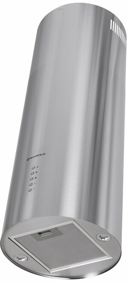 Максимально узкая кухонная вытяжка диаметром всего 351 мм и одна из самых недорогих среди островных моделей на рынке – MAUNFELD LEE LIGHT. Данная модель даже учитывая свои узкие размеры способна пропускать через себя до 1050 м3/час, что будет достаточно даже для крупных кухонных площадей и студий. Вытяжка имеет электронное кнопочное управление, с помощью которого можно выбрать одну из 3 скоростей турбины и включать/выключать подсветку рабочей зоны кухни.