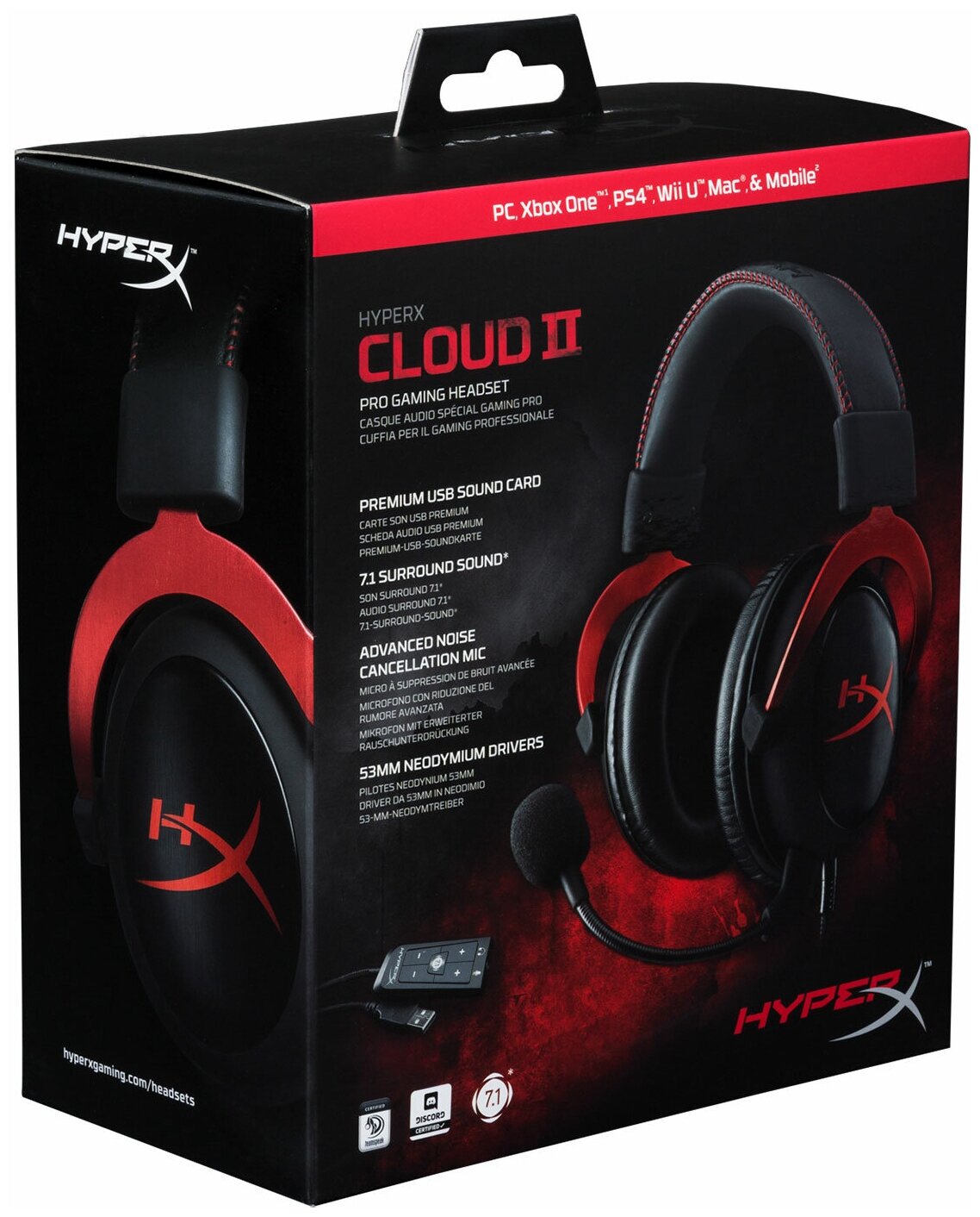 Гарнитура Kingston HyperX Cloud II включает USB-блок управления звуком, усиливающий звук и голос для превосходного Hi-Fi-гейминга — вы услышите всё в мельчайших подробностях. Пульт управления позволяет регулировать не только громкость звука, но и уровень микрофона, а также легко переключать функцию Surround Sound 7.1 или отключать микрофон. Эта гарнитура нового поколения создаёт виртуальный объёмный звук Virtual Surround Sound 7.1. Благодаря этой гарнитуре вы сможете точно определять местоположение своих оппонентов и наносить им удар ещё до того, как они заметят ваше приближение.