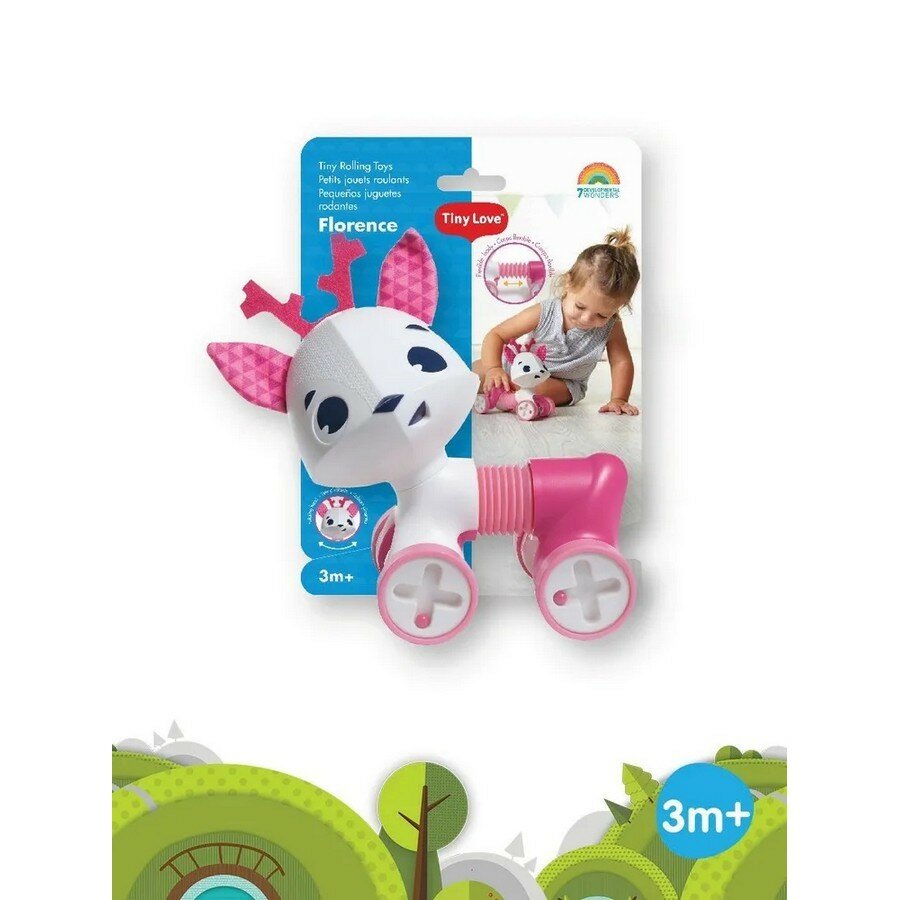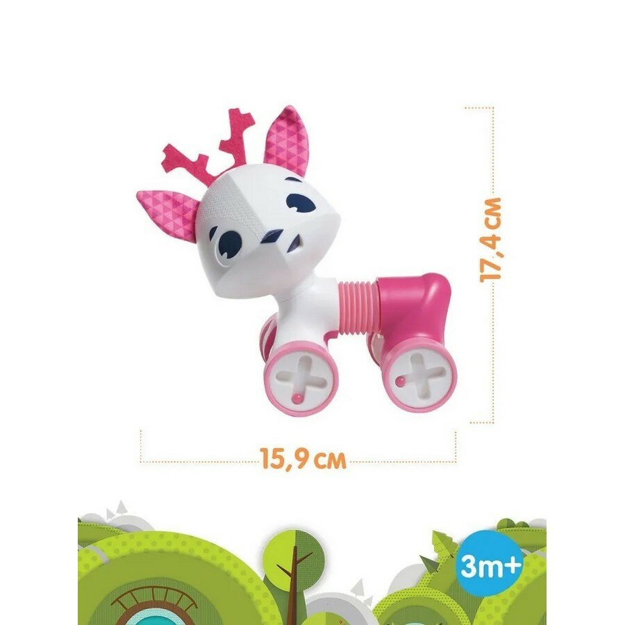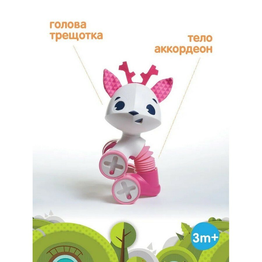 Развивающая игрушка-каталка Олененок Флоренс с большой головой, туловищем-гармошкой и 4-мя подвижными колесами вместо лапок. Рожки, ушки и туловище розового цвета. Во время движения издает гремящие звуки благодаря перекатывающимся бусинам внутри, поворачивает голову в разные стороны. А благодаря встроенной в туловище гармошке игрушка может сесть, сжаться, растянуться и изогнуться. Размеры игрушки 9х15,5х14,5 см.