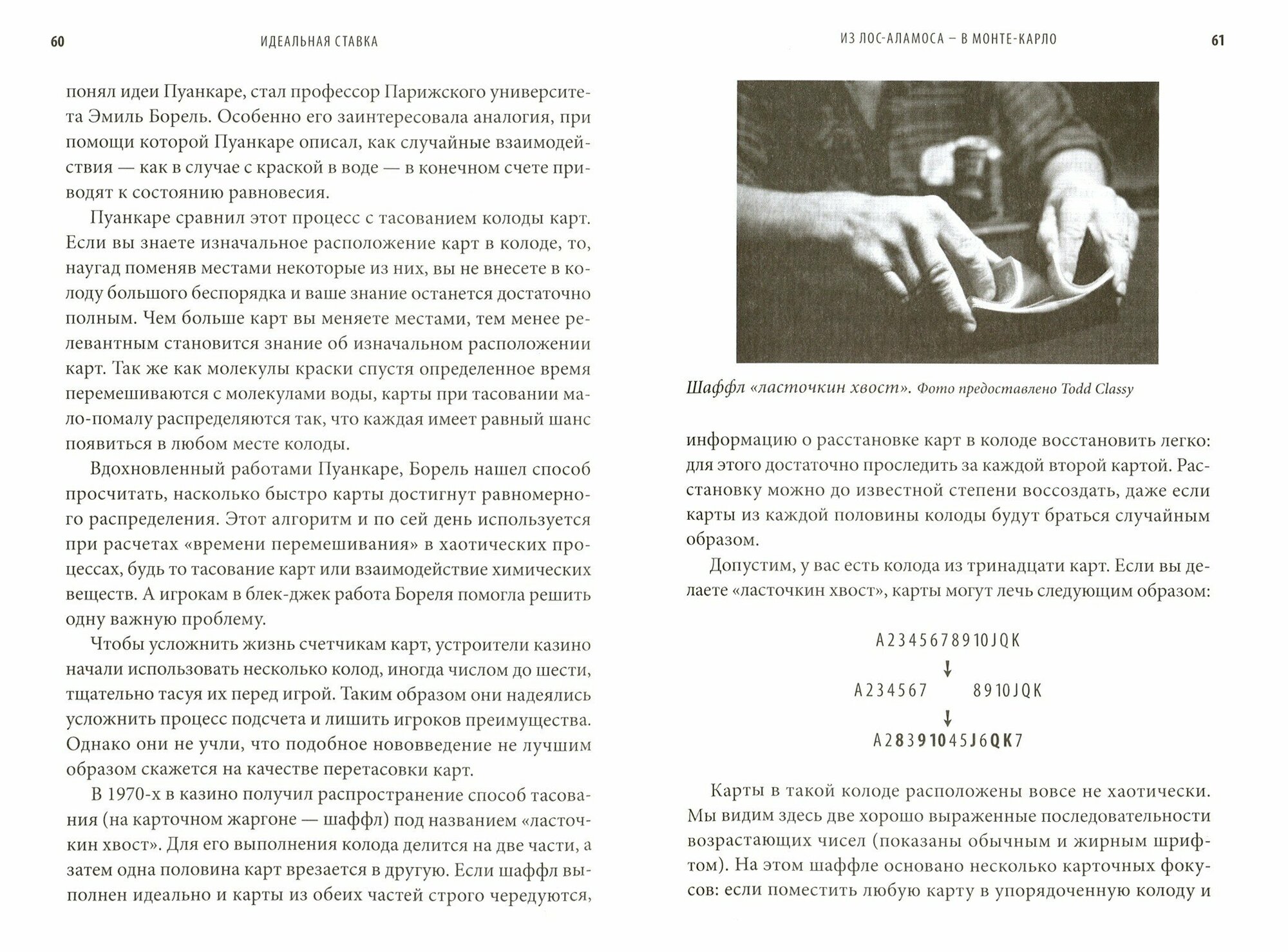 Фотографии страниц лучше чем сама книга. Если вчитаться в книгу, обнаружите потуги на популярный жанр журналистского повествования, когда события пытаются описывать как будто в художественном романе. Только эта книжка либо имеет скверный перевод, либо сам Адам неважный писатель. В отличие от прекрасных книг вроде "Хакеры - герои компьютерной революции" или "Just for Fun", написанных в том же стиле, эта книга написана сумбурно, много незаконченных мыслей. Постоянно кажется что тебя к чему то подводят, что за сказанным скрывается какой то смысл, а потом ... повествование плавно идёт дальше и подводит к чему то другому, в итоге после каждой главы чувство что остался в дураках. Да, в книге есть интересные сведения о знаменитых учёных, которые совершали очень интересные и даже странные поступки, пытаясь разгадать тайны случайности и азартных игр, но хватит ли сил дочитать в таком изложении ?