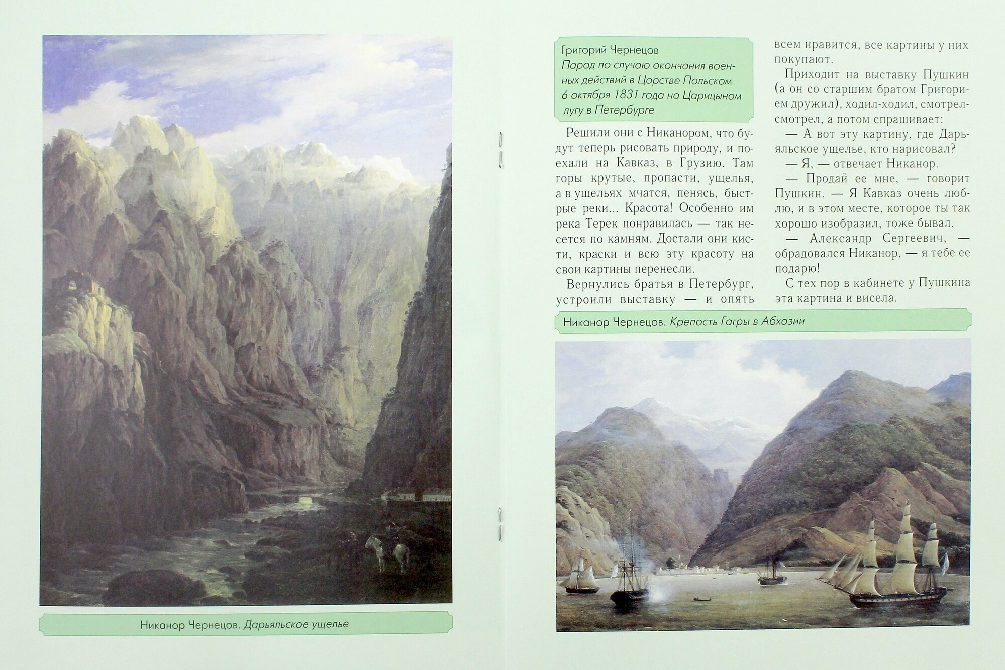 Братья Чернецовы - Григорий и Никанор - представители русского пейзажного искусства первой половины XIX века. Они закончили Академию художеств, стали академиками. Они были современниками Пушкина, и картина Никанора, младшего из братьев, "Дарьяльское ущелье", висела в доме поэта. Они много путешествовали, писали природу разных стран, но старались по мере сил отразить красоту Русской земли. ..Книга серии "Сказка о художниках" о братьях-художниках Чернецовых написана с большим юмором. В центре сказочного сюжета - история о том, как великая река Волга потребовала от талантливых братьев, которые собрались в Африку, чтобы писать картины об этом жарком крае, написать свой "портрет". Тогда и появился уникальный труд - панорама реки, которому не удалось дожить до наших дней: он был исполнен на бумаге. Автор сумел показать главное: художники были мастерами своего дела, писали, не покладая рук, и их наследие - это собрание великолепных работ, прославляющих природу Отечества. ..В книге много работ...