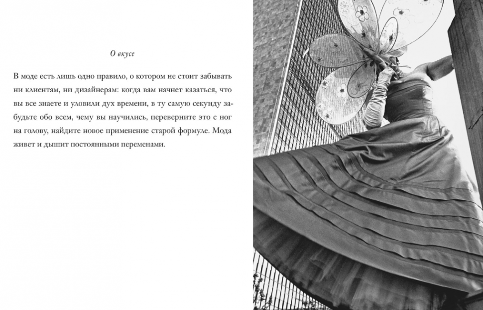 Платье сестры Мое первое воспоминание о моде - день, когда мама застала меня, четырехлетнего, дефилирующим по дому в лучшем платье сестры. Тем летним днем 1933 года мать прижала меня к стене гостиной и избила до полусмерти, пригрозив переломать все кости в моем тогда еще не знавшем запретов теле. Вкус и стиль Вкус не ограничивается одним стилем. Можно одеваться со вкусом шикарно, как голливудская звезда. А можно со вкусом завязывать фартук, будучи прислугой. Вкус - величина постоянная, стиль меняется от сезона к сезону. Стыдная профессия Блеск Нью-Йорка омрачало проживание с Харрингтонами. Мой дядя и кузены стыдились рассказывать своим друзьям, что я хотел стать дизайнером и шить женские платья. Тетя сохраняла нейтралитет, заявляя, что у каждого есть право заниматься выбранным делом, коль скоро это угодно Господу Всемогущему. Смена настроений Меня всегда восхищала эта быстрая смена настроений в модной индустрии: сегодня мы мягкие, как перышко, а завтра твердые, как кирпич; сегодня щебечем "Ах, дорогуша", а завтра обрушиваем на головы "дорогуш" всю злобу. Армия в цветах В лагере я был звездой камуфляжа. На моем шлеме красовался потрясающий маленький сад из цветов и травы. Помню, как мой вид раздражал сержанта, ведь мой великолепный головной убор посреди пустыни цвел подобно Эдемскому саду, а наш замаскированный отряд должен был подкрасться незаметно. Мода и её правила В моде есть лишь одно правило, о котором не стоит забывать ни клиентам, ни дизайнерам: когда вам начнет казаться, что вы все знаете и уловили дух времени, в ту самую секунду забудьте обо всем, чему вы научились, переверните это с ног на голову, найдите новое применение старой формуле.