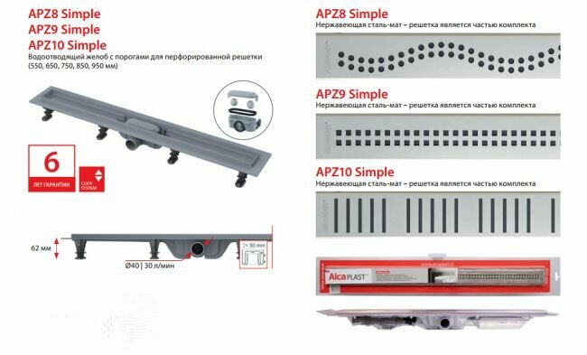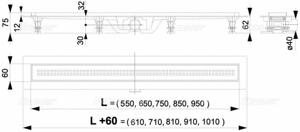 Душевой лоток Alca Plast APZ9 Simple 750х62 с сифоном и решеткой "Квадраты"