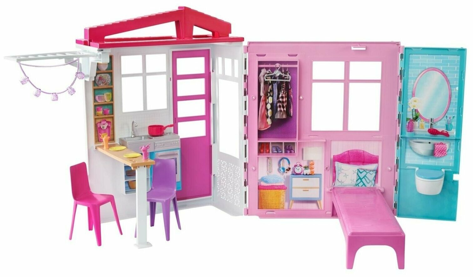 Каждая Барби просто обязана иметь свой красивый, оборудованный всем необходимым, домик. В складном чемоданчике, который можно переносить куда угодно, спрятаны 4 комнаты: