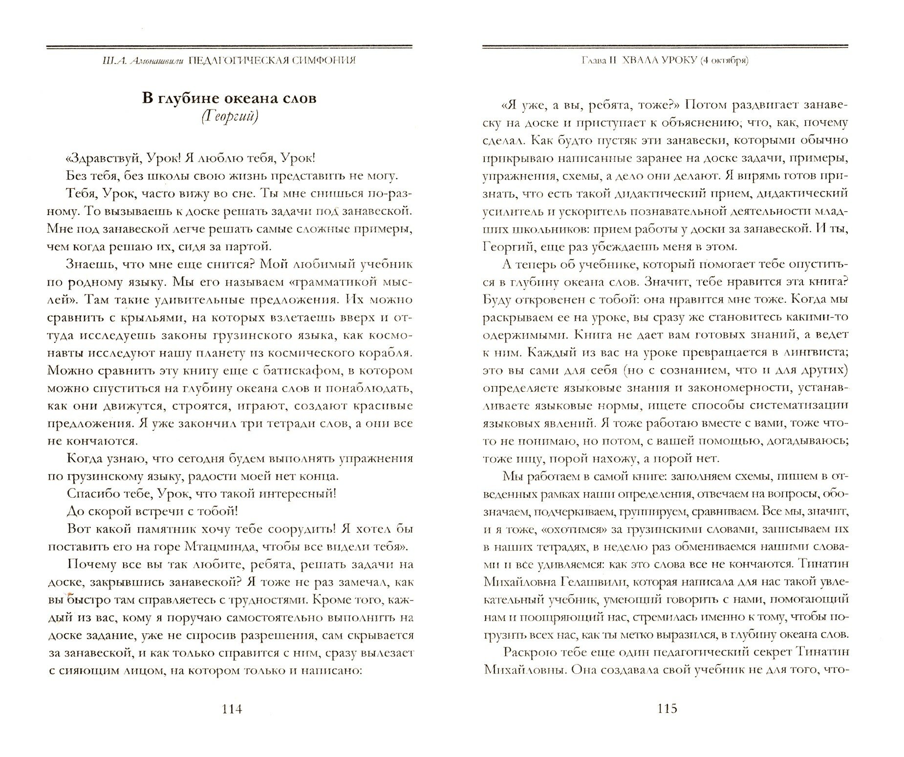 "Педагогическая симфония" - классическая работа известного педагога, академика Ш.А. Амонашвили, посвящённая методам школьного воспитания и образования. Автор делает акцент на установление доверительных, душевных отношений с детьми. Он считает, что учителя должны любить ребёнка, понимать ребёнка, восполняться оптимизмом к ребёнку, воспитывать в нём стремление к развитию, к взрослению, к свободе.