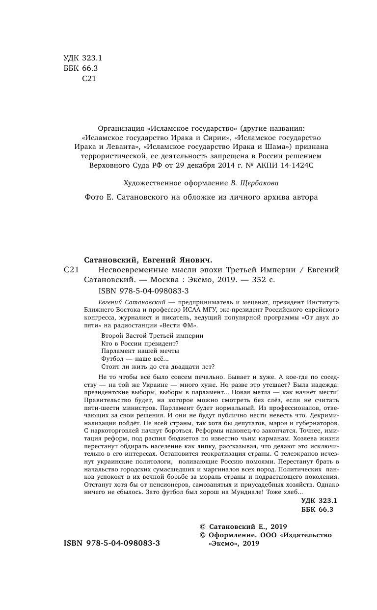 Несвоевременные мысли эпохи Третьей Империи (Евгений Сатановский); Эксмо, 2019