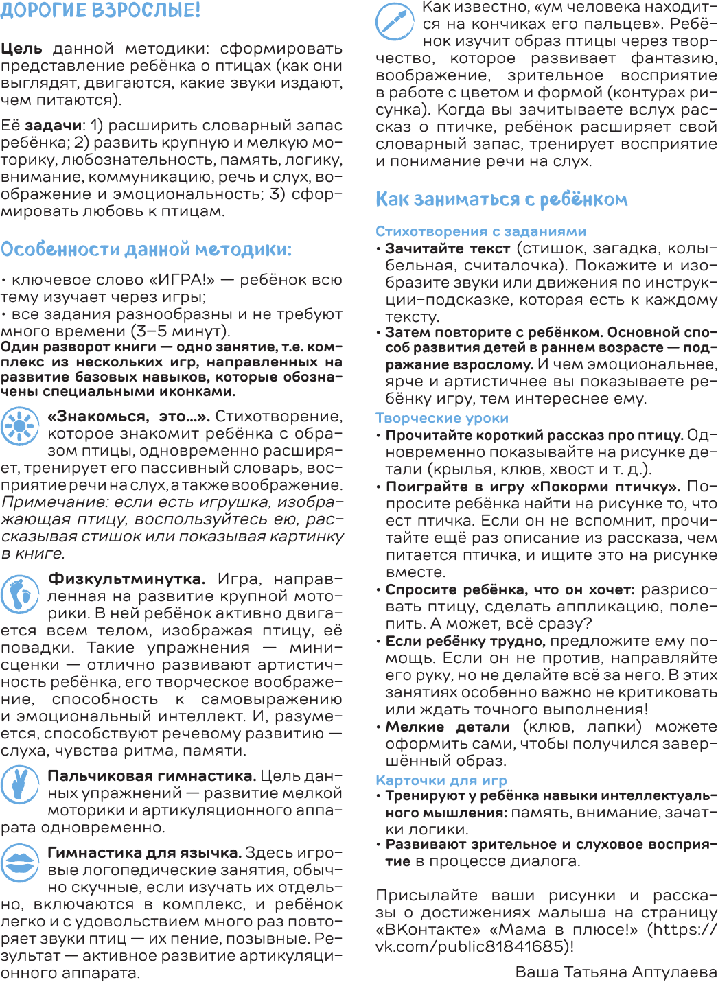Книга новой методики "С мамой! Развиваюсь и граю!" от автора бестселлеров для мам Татьяны Аптулаевой. Она поможет развить яркую индивидуальность ребенка. В книге вы найдете: готовые игры и задания, каждое займет не более 1-5 минут. Их можно повторять в любом месте и в любое время. Погрузитесь в мир птиц вместе с ребенком!