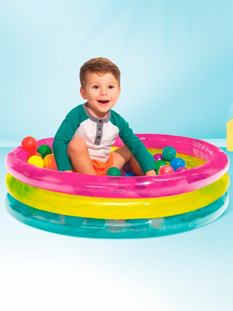 Яркий надувной центр служит сухим бассейном. Он так же отлично справится с ролью манежа для самых маленьких. Надувной бассейн состоит из трех надувных колец, каждое из которых, имеет собственный клапан для надува. Детский игровой центр предназначен специально для веселого и безопасного времяпрепровождения. Высокие мягкие бортики смогут защитить ребенка от травм.