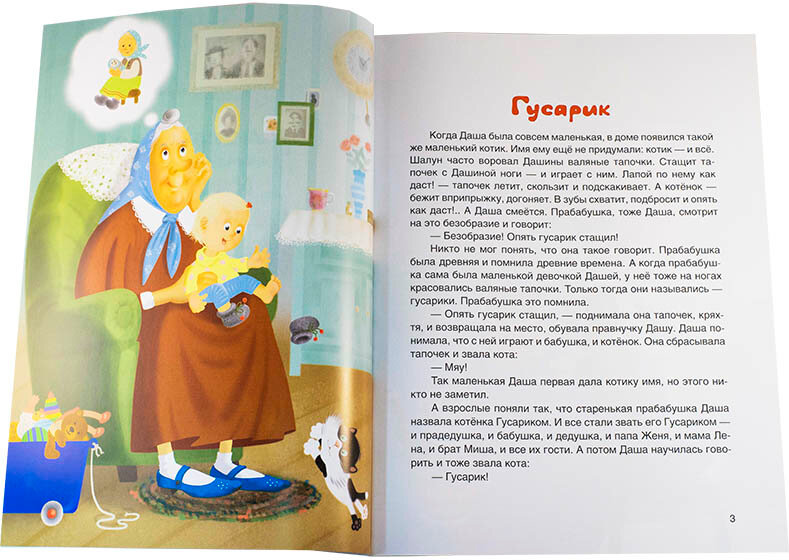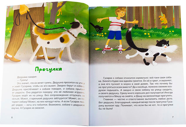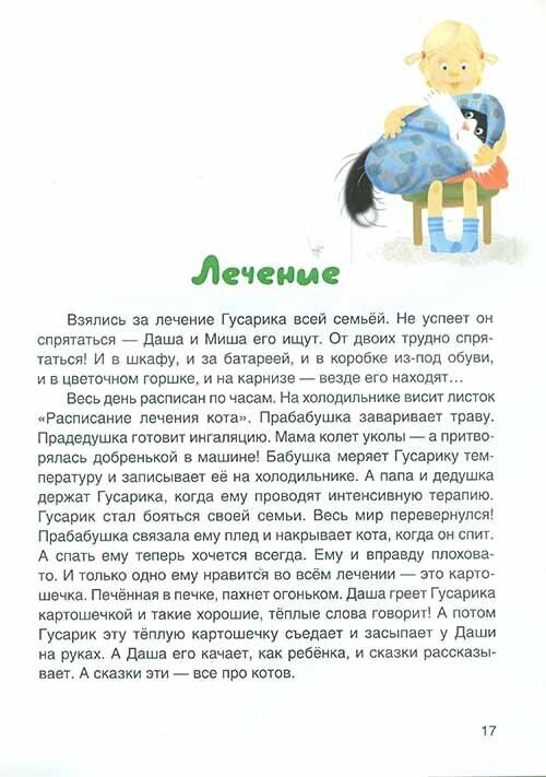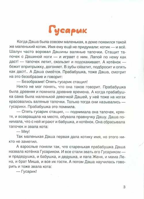 Невероятно добрая книга. Прочитали с ребёнком 5 лет за пару вечеров. Очень интересные коротенькие истории из жизни одной семьи с питомцем котом Гусариком. Написано с юмором, над каждой историей ребенок смеялся, да я тоже. Прочитали мы с ребёнком 5 лет, а также и старшие дети 11 лет. Всем книга очень понравилась. Формат А4, крупный шрифт, симпатичные иллюстрации, мягкая обложка на скрепке. Книгу рекомендую детям от 4-5 лет и старше!