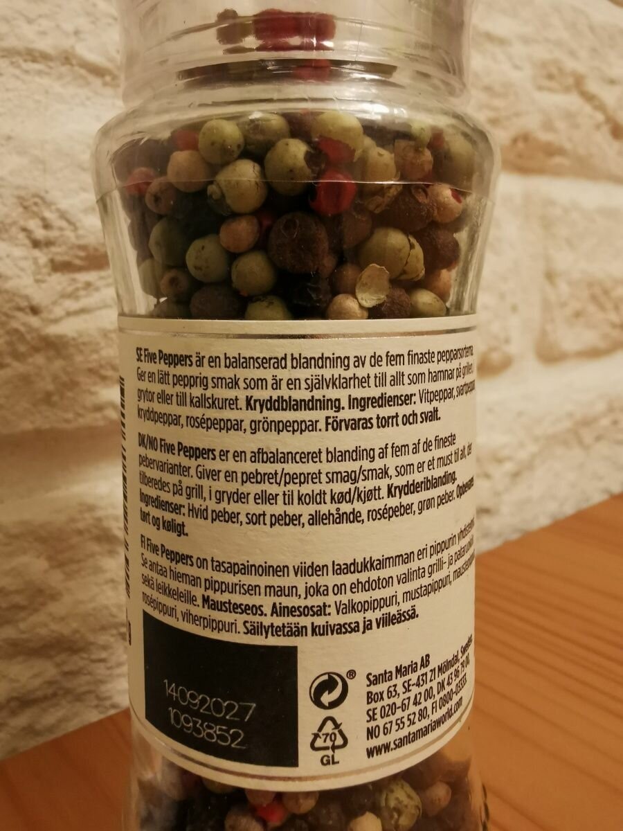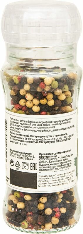 | Состав товара | Белый и черный перец, душистый перец, перец розе, зеленый перец. |