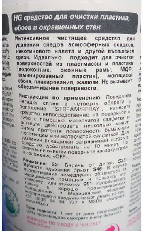 Средство чистящее HG Для пластика, обоев и окрашенных стен представляет собой интенсивное чистящее средство для удаления следов атмосферных осадков, никотиновых пятен, пыли и других въевшихся загрязнений. Не вызывает обесцвечивания поверхности. Идеально подходит для очистки поверхностей из пластмассы и пластика (подоконник, оконные рамы, МДФ, ламинированный пластик), моющихся обоев, плакирования, жалюзи.