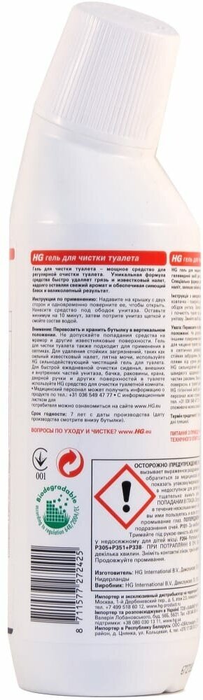 Сильнодействующий чистящий гель HG Для туалета предназначен для очистки и удаления известкового налета со стенок унитаза. Подходит для ежедневного применения. Обладает свежим ароматом. Уникальная формула средства быстро удаляет грязь и известковый налет, оставляя великолепный сияющий результат.