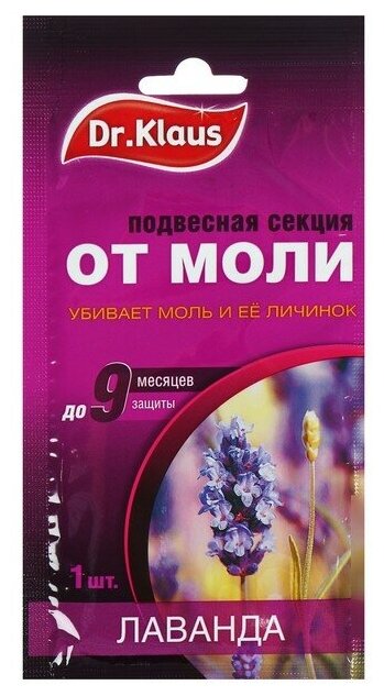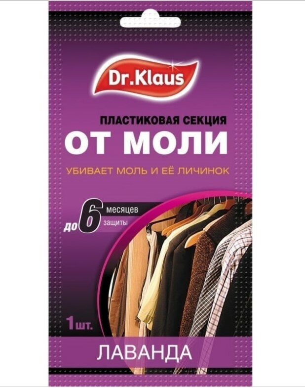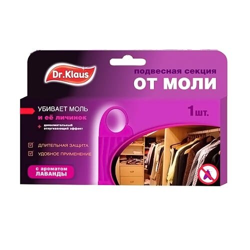 Подвесная секция от моли Dr.Klaus Лаванда предназначена для защиты шерсти, меха и изделий из них от повреждения молью. Обладает приятным ароматом лаванды. В состав формулы входит современное быстродействующее вещество трансфлутрин. Отлично справляется как с бабочками, так и с личинками моли - главными вредителями.