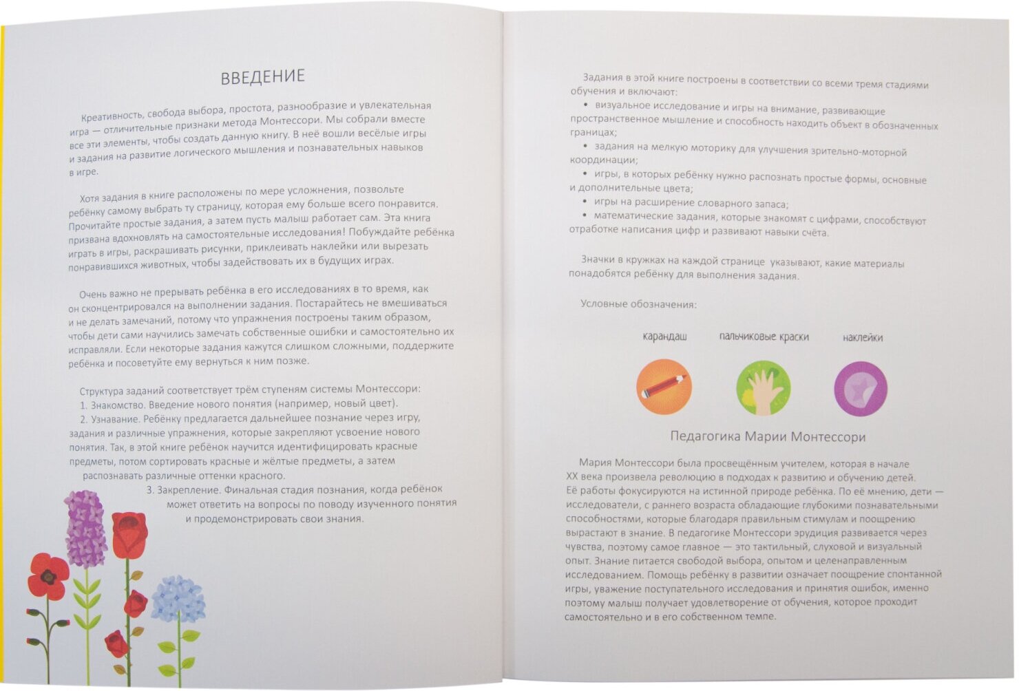 Красочная книга-активити с наклейками «В саду» предназначена для развития логического мышления и познавательных навыков в игровой форме. В книге ребенка ждет множество разнообразных заданий, в основу которых положены основные принципы метода Монтессори: креативность, свобода выбора, простота и увлекательность игры. Распределяя по страницам наклейки, дорисовывая и раскрашивая картинки, решая интересные задачи и головоломки, ребенок познакомится с окружающим миром, освоит навыки счета, научится различать оттенки цветов и ориентироваться в пространстве. Что такое метод Монтессори? Как построить занятия, чтобы они приносили не только радость, но и пользу? Ответы на эти вопросы родители найдут в начале книги.