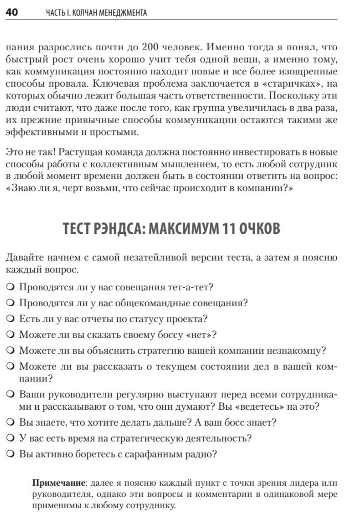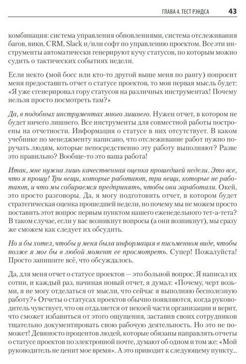 "Это книга по менеджменту, полная инсайтов, идей и мнений о том, как следует руководить людьми. Вся приведенная здесь информация основана на моем личном опыте взаимодействия с реальными людьми (с которыми я общаюсь до сих пор). Мне бы очень хотелось сказать, что мой опыт лидерства всегда был положительным, но это не так. Несколько раз мне по-настоящему срывало крышу, причем при свидетелях. И именно эти свидетели помогали мне снова взять себя в руки и тем самым давали материал для еще одной страницы этой книги".