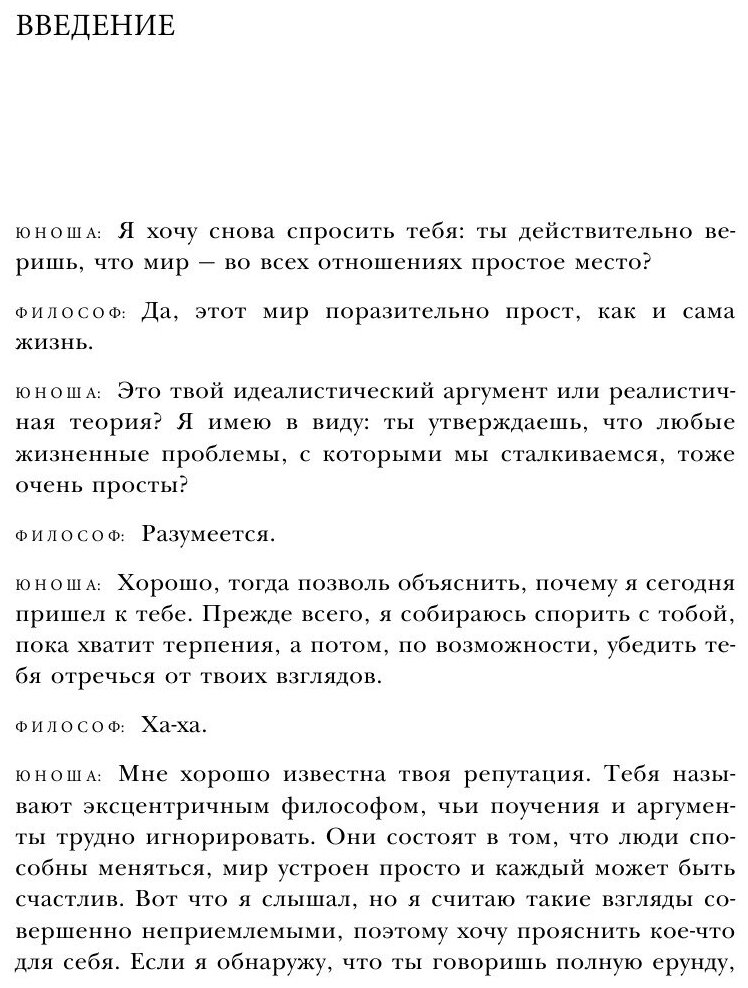 книга читается легко, диалог мудрого философа и достаточно продуманного юноши, захватывает, философ рушит многие устоявшиеся в обыденности утверждения, которыми аппелирует юноша, для познания себя, нужная книга, философ смещает акценты, выводит на понимание как быть целостным в отношении себя, своих близких, формирует некий нестандартный подход к оценке событий, себя в этих событиях, не останетесь прежним, прочтя эту книгу