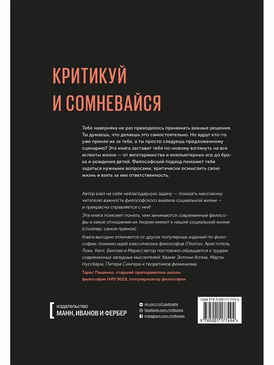 В этой книге Фернер затронул все глобальные моральные вопросы, с которыми мы сталкиваемся в обычной жизни. Что такое спор, и выигрываем ли мы, когда переубеждаем оппонента? Зачем мы вступаем в брак и уверены ли мы, что знаем, что это такое? Если мы утверждаем, что любим животных, обязаны ли мы становиться вегетарианцами? А как насчет глобального потепления - как себя вести и надо ли верить ученым, которые нагнетают страх? Фернер предлагает забыть о "традиционных" ответах и посмотреть на все эти вещи с новой стороны - результат может очень сильно удивить.