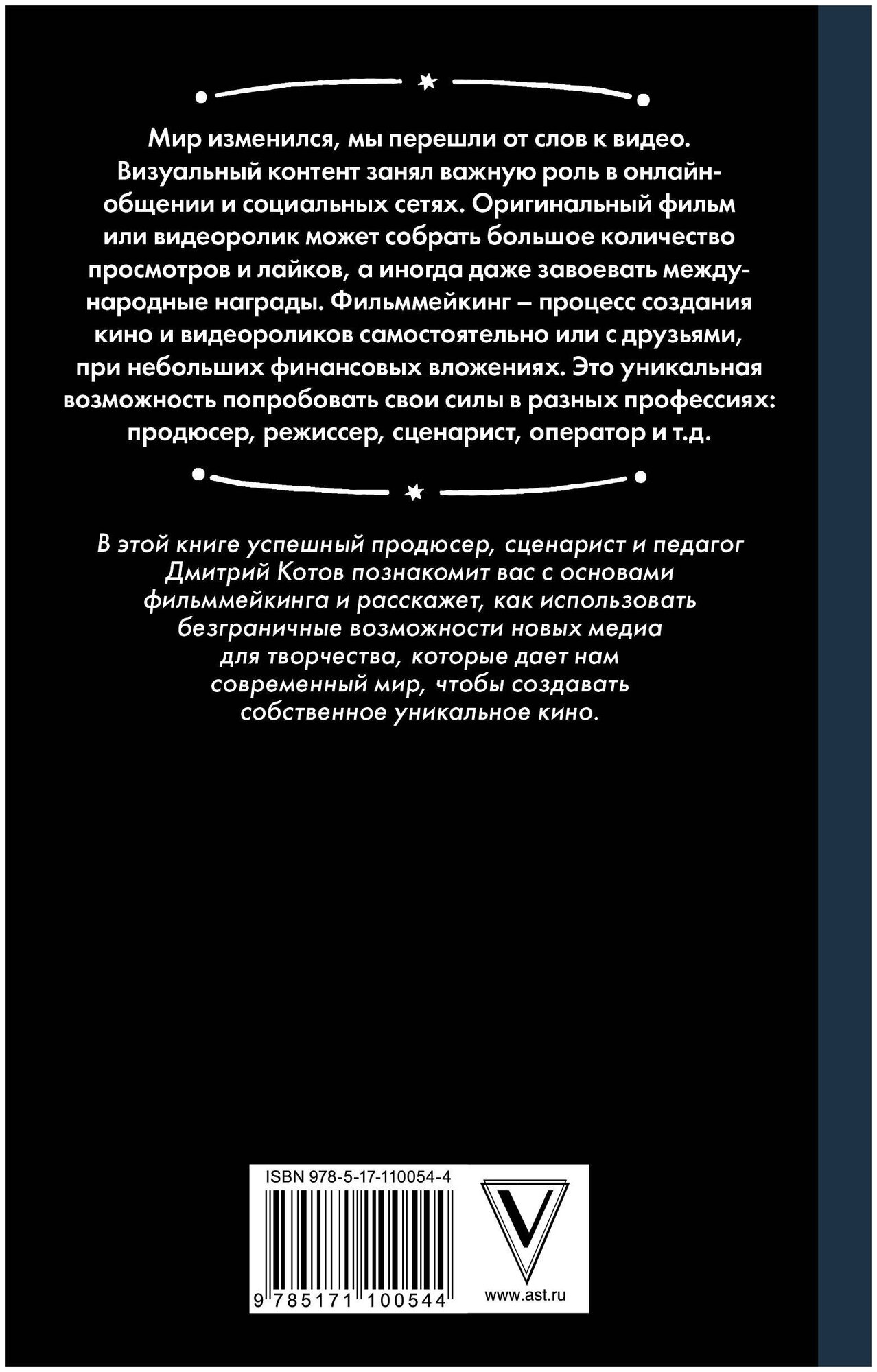 Мир изменился, мы перешли от слов к видео. Визуальный контент занял важную роль в онлайн-общении и социальных сетях. Оригинальный фильм или видеоролик может собрать большое количество просмотров и лайков, а иногда даже завоевать международные награды. Фильммейкинг - процесс создания кино и видеороликов самостоятельно, или с друзьями, при небольших финансовых вложениях. Это уникальная возможность попробовать свои силы в разных профессиях: продюсер, режиссер, сценарист, оператор и т.д. В этой книге успешный продюсер, сценарист и педагог Дмитрий Котов познакомит вас с основами фильммейкинга и расскажет, как использовать безграничные возможности новых медиа для творчества, которые дает нам современный мир, чтобы создавать собственное уникальное кино.