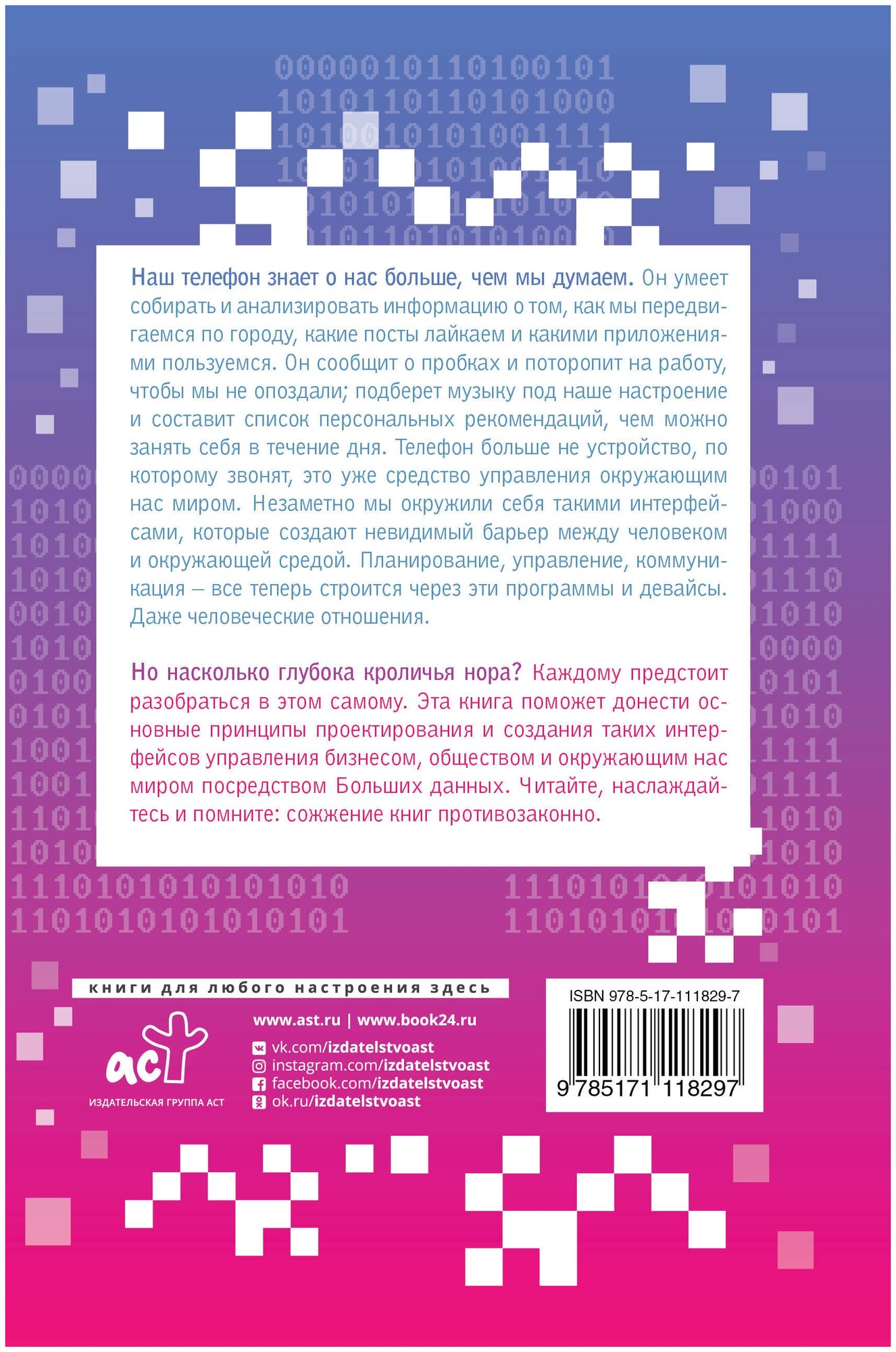 Наш телефон знает о нас больше, чем мы думаем. Он умеет собирать и анализировать информацию о том, как мы передвигаемся по городу, какие посты лайкаем и какими приложениями пользуемся. Он сообщит о пробках и поторопит на работу, чтобы мы не опоздали; подберет музыку под наше настроение и составит список персональных рекомендаций, чем можно занять себя в течение дня. Телефон – больше не устройство, по которому звонят, это уже средство управления окружающим нас миром. Незаметно мы окружили себя такими интерфейсами, которые создают невидимый барьер между человеком и окружающей средой. Планирование, управление, коммуникация, все теперь строится через эти программы и девайсы. Даже человеческие отношения. Но насколько глубока кроличья нора? Каждому предстоит разобраться в этом самому. Эта книга поможет донести основные принципы проектирования и создания таких интерфейсов управления бизнесом, обществом и окружающим нас миром посредством Больших данных. Читайте, наслаждайтесь и помните: сожжение книг противозаконно.