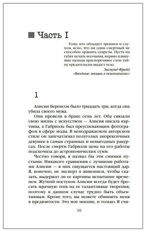 Эксперт-психотерапевт Тео Фабер убежден - он сможет помочь Алисии там, где все остальные врачи потерпели неудачу. Одержимый расследованием ее преступления, он понимает: молчание Алисии гораздо многозначительнее, чем кажется. Но захочет ли Тео услышать правду, если пациентка заговорит?