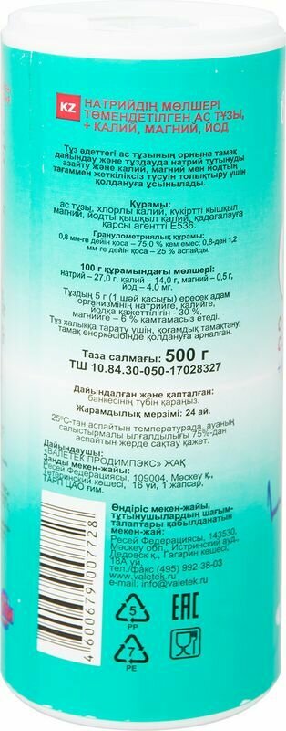 Соль пищевая калий, магний и йод 500гр от бренда Валетек (Палитра вкусов), производство Россия . Изготовлена на основе пищевой выварочной соли сорта "экстра" с содержанием противослеживающей добавки E536 менее 0,001%. Рекомендуемое потребление соли не более 5 г (1 чайная ложка) в день, что полностью обеспечивает суточную потребность организма взрослого человека в натрии и йоде, в калии - на 30%, в магнии - на 6%. Содержание в 100 г: натрий - 27 г, калий - 14 г, магний - 0,5 г, йод - 4 мг. Гранулометрический состав: до 0,8 мм включительно - не менее 75%, свыше 0,8 до 1,2 мм включительно - не более 25%. Срок годности 24 месяца. Лучшее сочетание цены и качества. Соль важная приправа для приготовления любого блюда. Пищевую соль можно использовать как специю для приготовления различных блюд . Банка с солью прекрасно подойдёт для использования как солонка для соли. Наша соль не отличается от обычной соли по вкусу, солёности, цвету и запаху. Эту соль можно использовать не только для досаливания , но и в процессе приготовления пищи (кроме консервирования). Соль является основным источником натрия - ценного и необходимого организму вещества. Можно использовать для мяса для овощей для супа морская мелкая белая для кондитерских изделий крупная песок вкусно полезно для диабетиков здоровое питание для желудка пищеварение готовые блюда заготовки готовим едим дома жаркое выпечка кондитерские изделия пироги хлеб соленья дети для здоровья профилактика ЗОЖ диабетикам правильное питание едим дома выпечка зож питание для детей здоровое питание общеукрепляющий тонус иммунитет для желудка при простуде овсяный взвары сухой просто добавь воды круглый год кухня готовим едим дома домашние заготовки полезно.