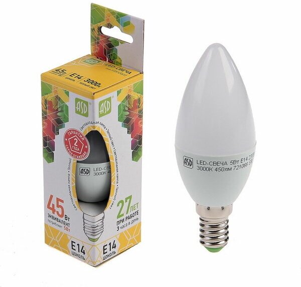 Матовая светодиодная лампа ASD в форме свечи серии LED-СВЕЧА-standard применяется для основного и декоративного освещения в жилых и общественных помещениях. Подойдет для интерьерных светильников с компактными плафонами. Благодаря изящному дизайну может стать самодостаточным украшением в люстрах с открытым абажуром. Эффективно заменяет лампу накаливания - малое энергопотребление позволяет экономить до 90% электроэнергии. Класс энергоэффективности «А», яркий белый теплый свет, низкая теплоотдача, безопасный для глаз коэффициент пульсации, устойчивость к механическому воздействию, срок службы 30 000 часов и оригинальная форма делают эту лампу одной из самых популярных моделей. Линейка светодиодных ламп LED-СВЕЧА-standard от компании ASD представлена в диапазоне мощностей от 3.5 Вт до 10 Вт и двух вариациях цоколя (Е14 и Е27). Гарантия 2 года.