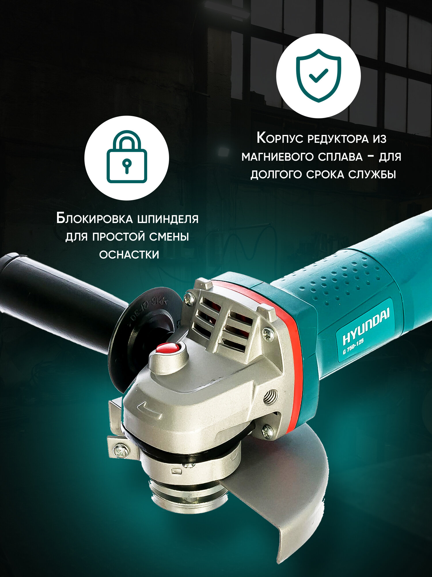УШМ HYUNDAI . Корпус редуктора изготовлен из магниевого сплава. Блокировка шпинделя для простой смены оснастки. Электронная регулировка оборотов. Узкий корпус для комфортной работы. Дополнительная рукоятка для удобного использования.