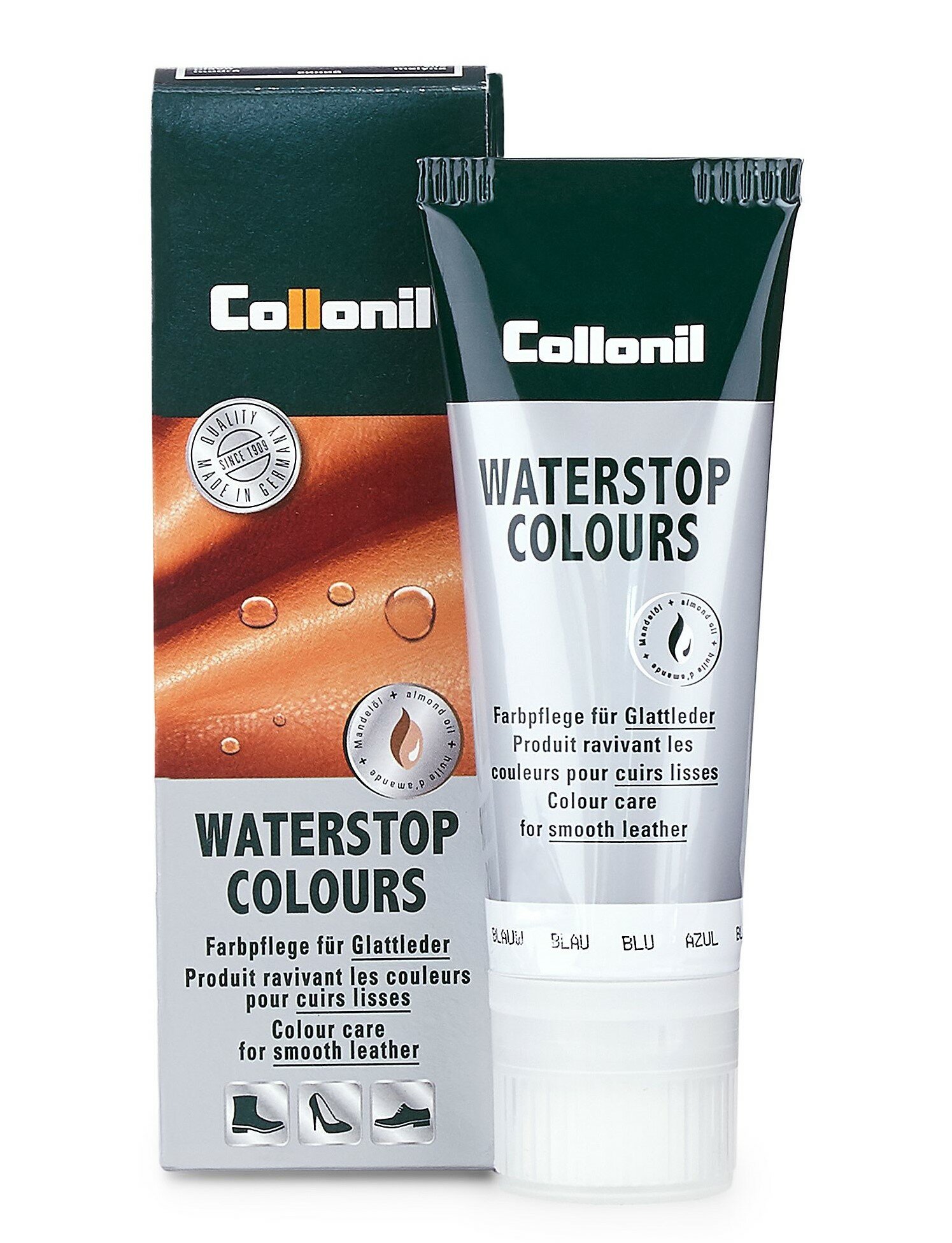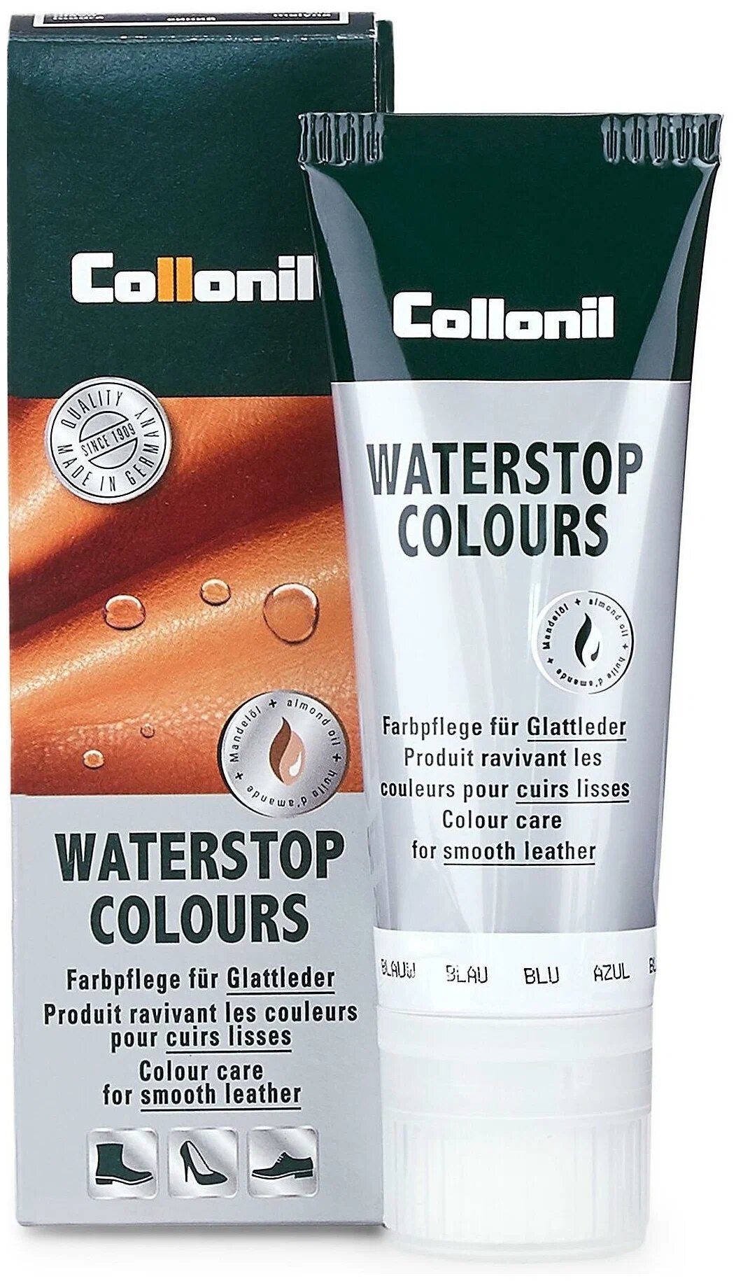 Крем Collonil Waterstop Colours водоотталкивающий для ухода за всеми видами гладкой кожи. Защищает от влаги и ухаживает за материалом благодаря фтороуглеродным соединениям. Предохраняет изделие от глубоких загрязнений и солевых разводов. Содержит воск и миндальное масло, интенсивно смягчающее и ухаживающие за кожей. Подходит для Hi-Tech материалов.