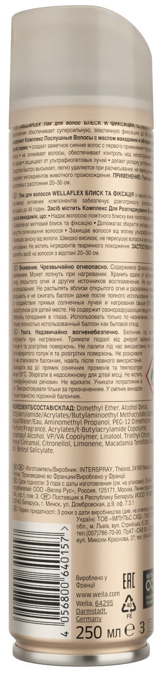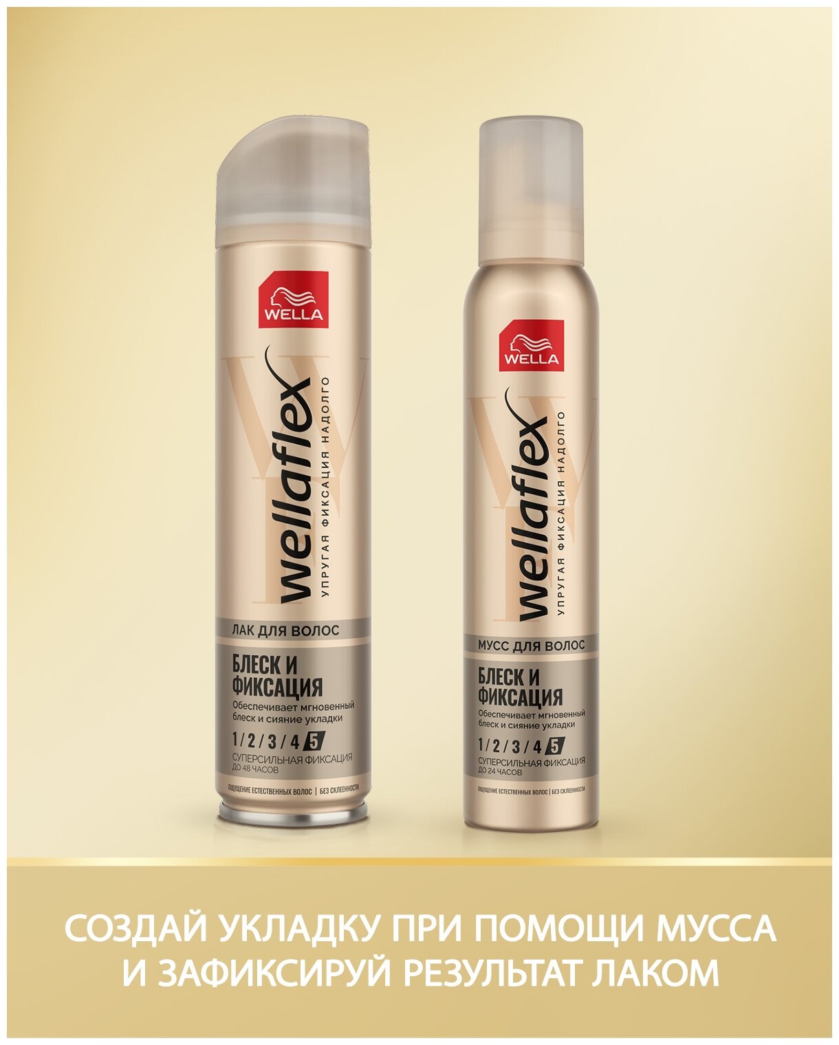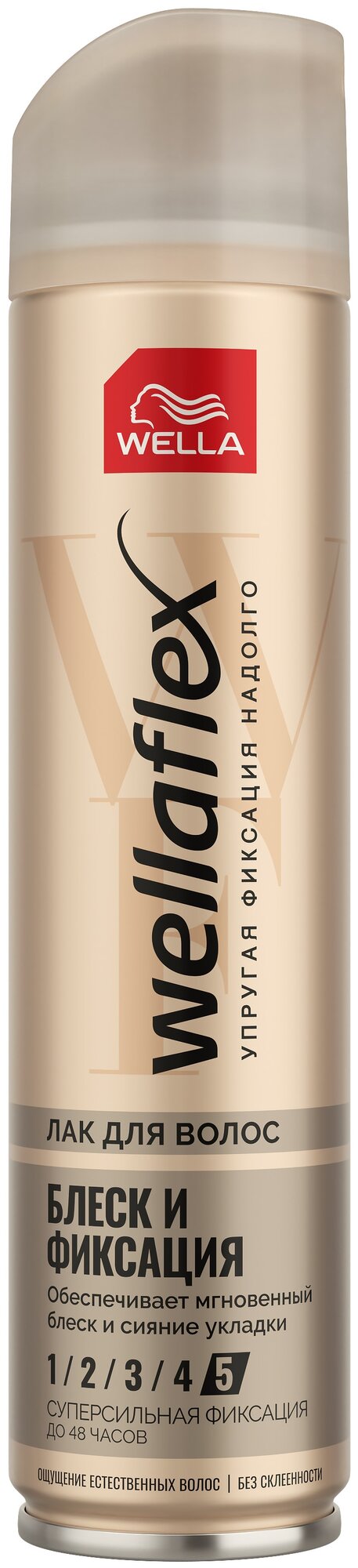 Лак для волос Wellaflex Блеск и фиксация супер-сильной фиксации содержит светоотражающие частицы, которые мгновенно придают прическе здоровое сияние и блеск. Лак для волос с технологией FlexActive суперсильной фиксации придает вашим волосам 3 признака естественной и упругой укладки: сохраняет естественный вид, сохраняет подвижность волос без склеивания, легко удаляется при расчесывании.