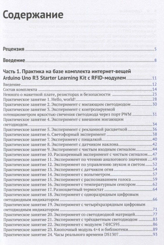 Первая часть посвящена теории и решению 34 практических заданий для Arduino Uno в среде Arduino IDE со всеми датчиками, модулями и другими компонентами соответствующего набора интернет-вещей, включая RFID-модуль, и предназначена для изучения как этих компонентов, так и основ схемотехники, по принципу от простого к сложному. Каждое задание содержит перечень компонентов, краткую теорию по компонентам, две схемы соединения компонентов с платой - принципиальную и "макетную", сделанные с помощью среды Fritzing, а также программный код.