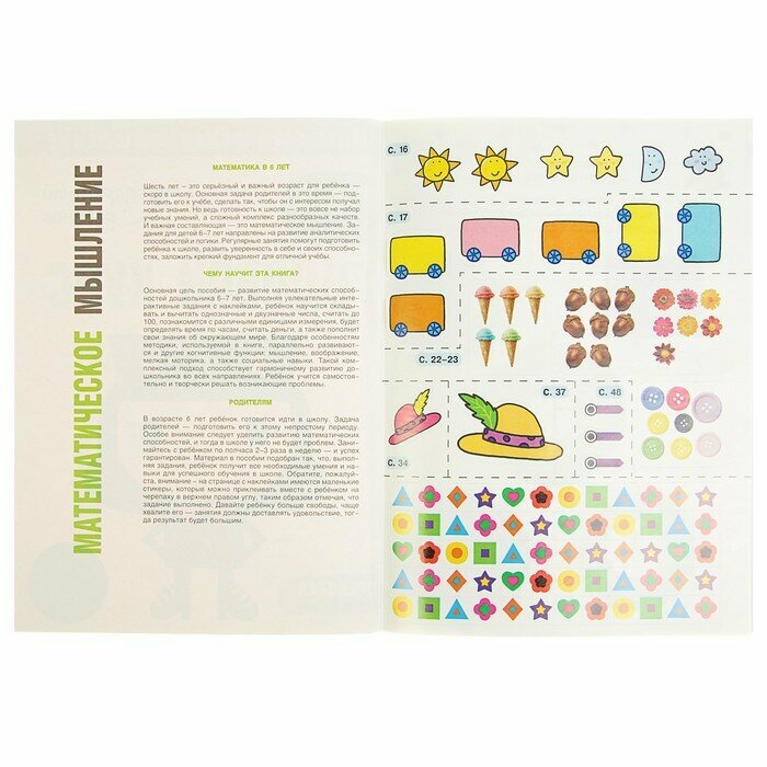 Важнейшая задача книги - развитие у ребенка 6-7 лет математического мышления. Пособие наполнено яркими красочными картинками, которые можно обсудить и приклеить на них наклейки. Выполняя увлекательные интерактивные задания с наклейками, ребёнок научится складывать и вычитать однозначные и двузначные числа, считать до 100, познакомится с различными единицами измерения, будет определять время по часам, считать деньги, а также пополнит свои знания об окружающем мире. Благодаря особенностям методики, используемой в книге, параллельно развиваются и другие когнитивные функции: мышление, воображение, мелкая моторика, а также социальные навыки. Такой комплексный подход способствует гармоничному развитию малыша во всех направлениях. Ребёнок учится самостоятельно и творчески решать возникающие проблемы.
