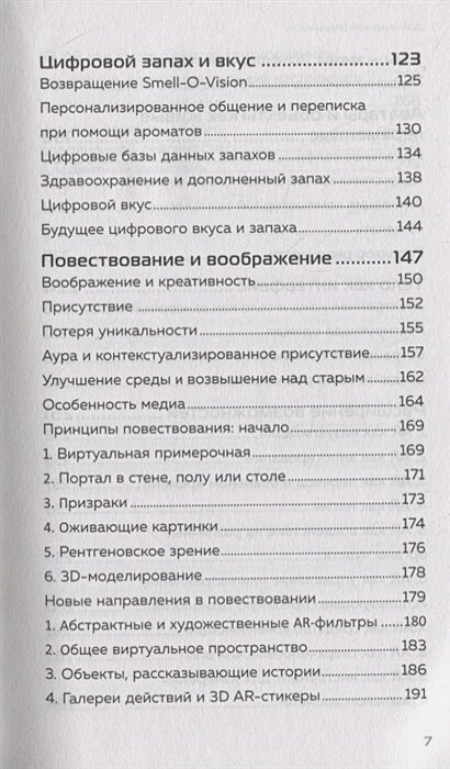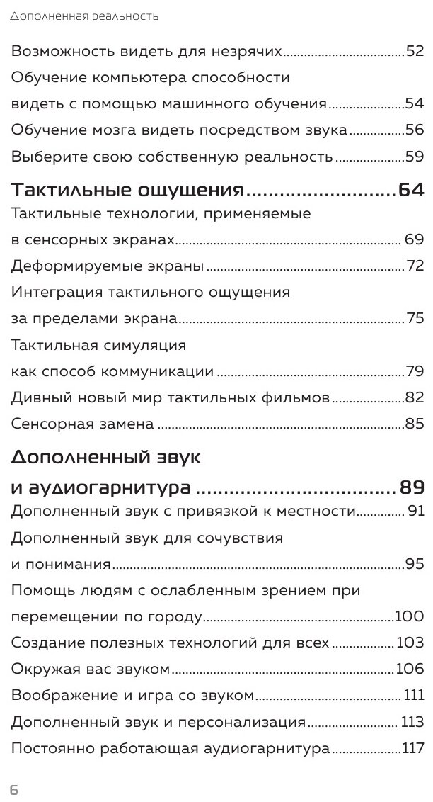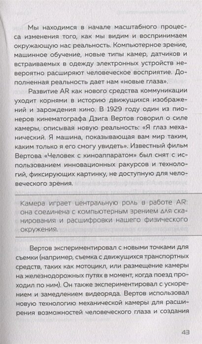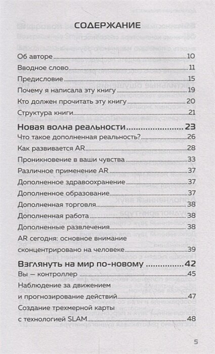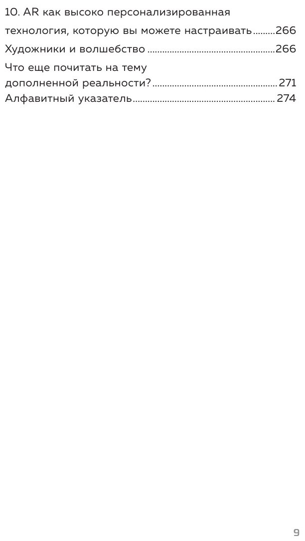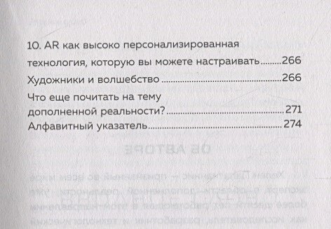 Пожалуй, самая лучшая книга для ознакомления с современными направлениями разработки дополненной реальности. Автор привела большое количество кейсов использования AR-технологии. Чаще всего эта технология вспоминается в связи с игрой Pockemon Go, однако ее применение гораздо шире, чем использование в играх, наложение масок для получения фоточек в ВК или перевод в Google Translate. AR это еще и звук, и вкус, и запах. И вряд-ли кто может представить, как изменится наше восприятие реальности с применением целого комплекса технологий, когда само тело станет интерфейсом.