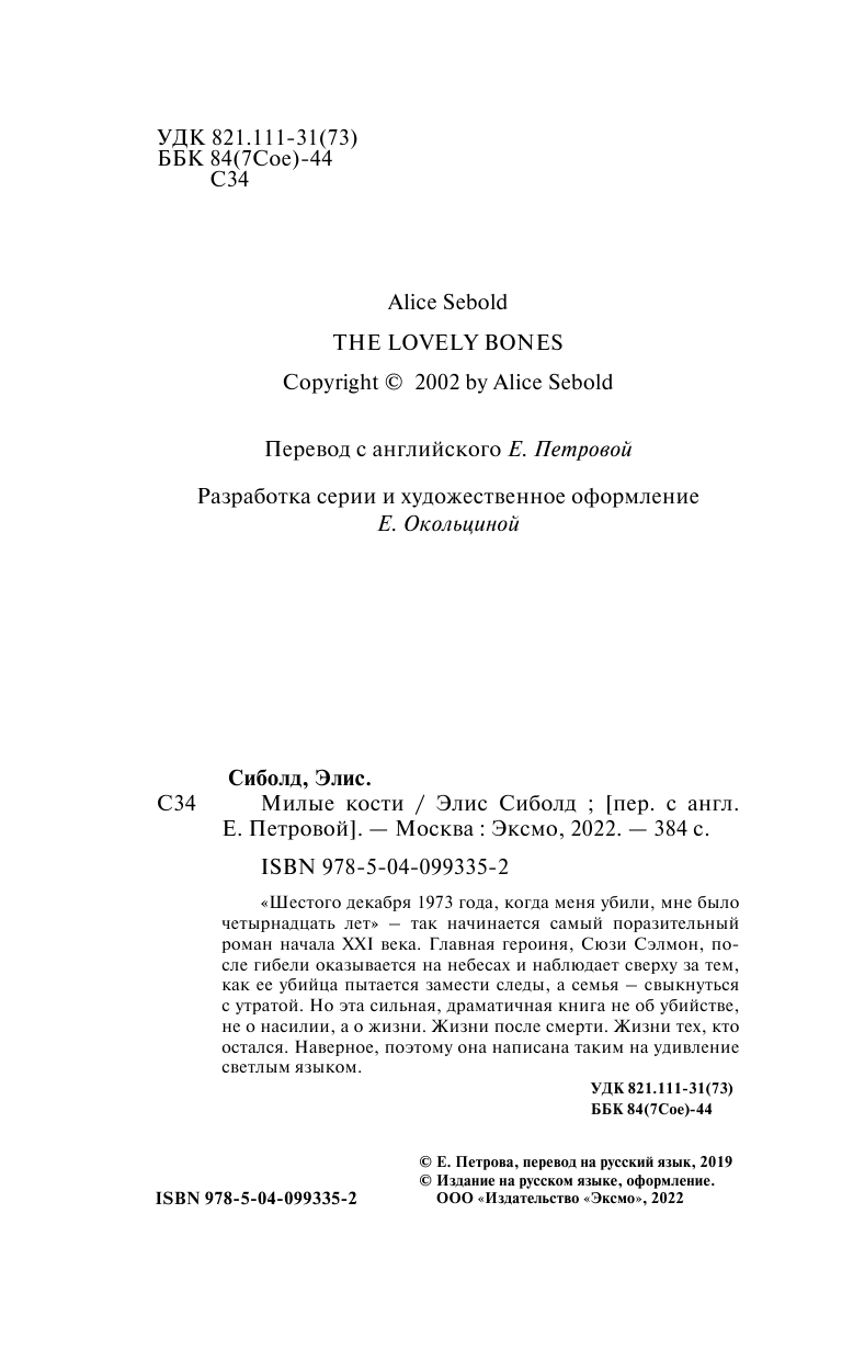 Книга: Милые кости (Элис Сиболд); Like Book, Редакция 1, 2020