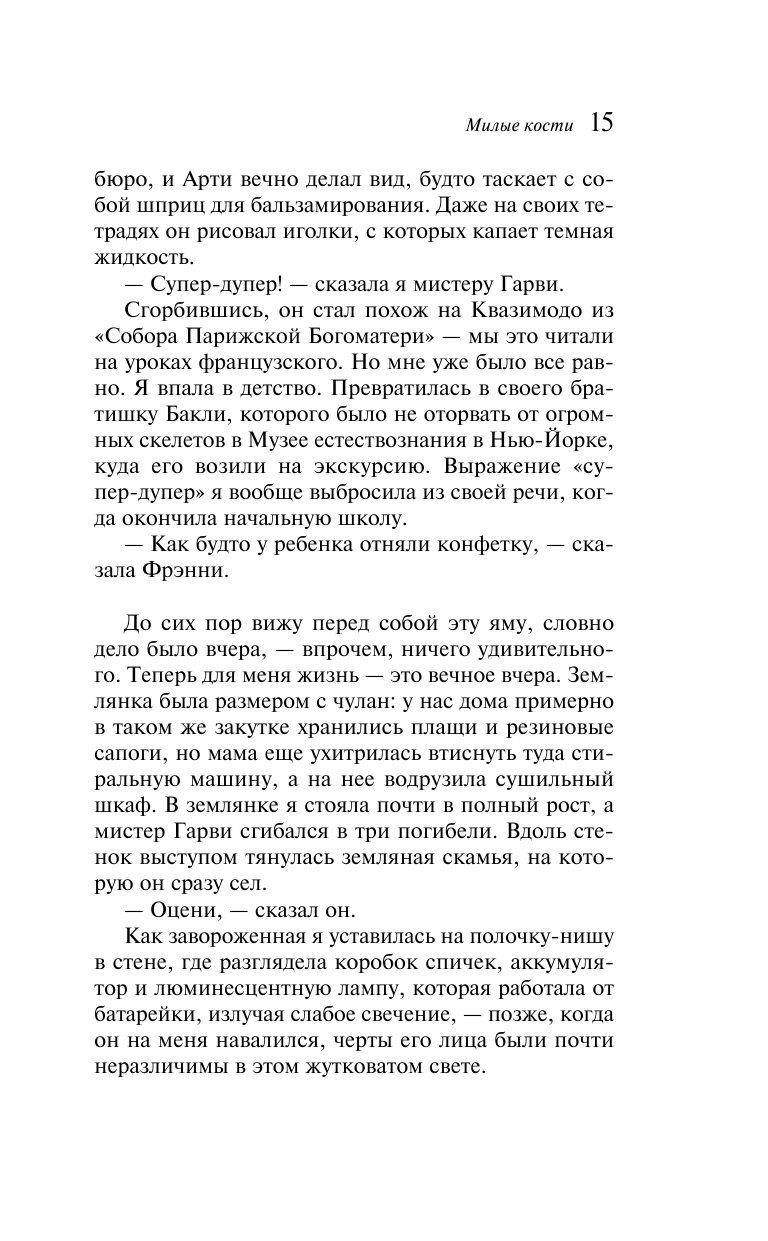 "Шестого декабря 1973 года, когда меня убили, мне было четырнадцать лет", - так начинается самый поразительный роман начала XXI века. Главная героиня, Сюзи Сэлмон, после гибели оказывается на небесах и наблюдает сверху за тем, как ее убийца пытается замести следы, а семья - свыкнуться с утратой. Но эта сильная, драматичная книга не об убийстве, не о насилии, а о жизни. Жизни после смерти. Жизни тех, кто остался. Наверное, поэтому она на удивление легко читается и не оставляет тягостного ощущения.