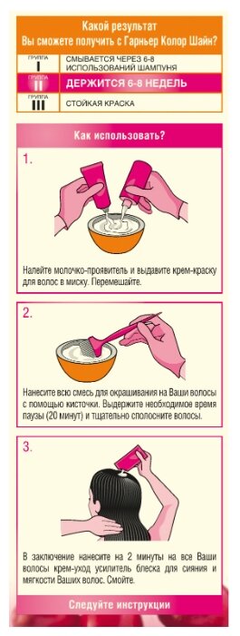 Garnier Color&Shine — это краска-уход без аммиака, которая не только бережно ухаживает за волосами, делая их мягкими, но и отлично закрашивает седину. Содержит экстракт клюквы — признанный антиоксидант, который значительно продлевает сияние цвета. Благодаря питательным свойствам арганового масла волосы защищены от сухости, а блеск максимально усилен. Краска-уход придаст волосам несравненную мягкость, а стойкий цвет останется сияющим даже после 28 применений шампуня.Способ применения: смешать крем-краску и молочко-проявитель; нанести на волосы; подождать рекомендуемое количество минут и смыть; нанести бальзам.