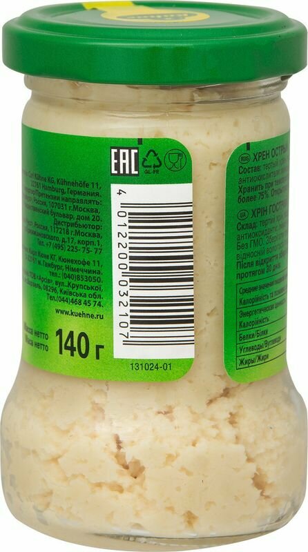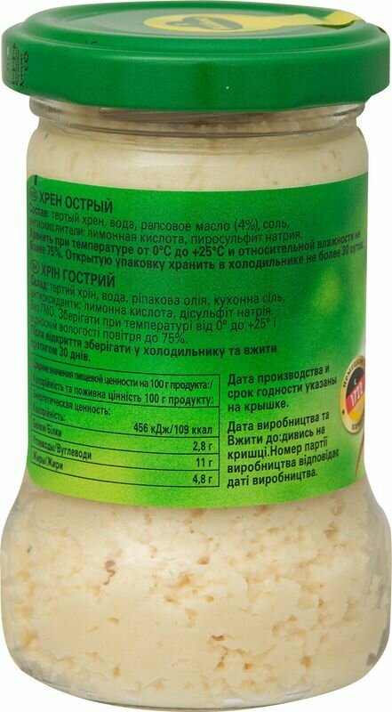 | Состав | Тертый хрен, вода, рапсовое масло (4%), соль, антиокислители: лимонная кислота, пиросульфит натрия. |