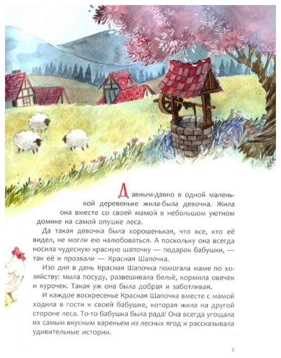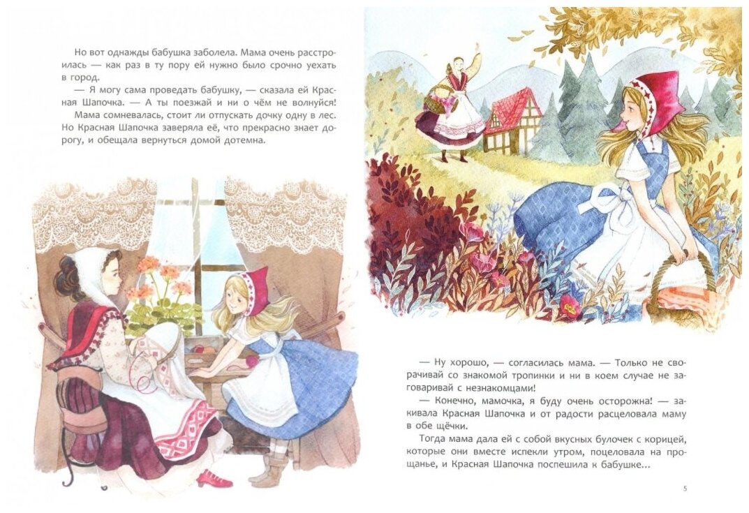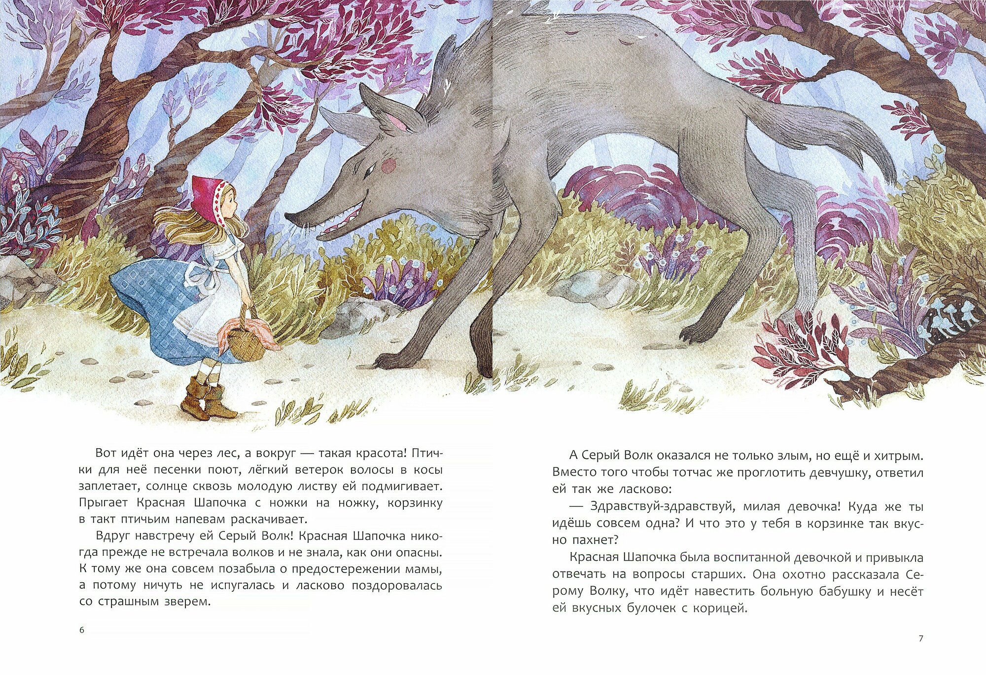 Купила книгу из-за картинок, очень красочные, да и стиль художницы мне приглянулся. Персонажи получились яркие и живые, волк особенно понравился. Качество печати порадовало, картинок много. Это одна из любимых сказок моей младшей дочери и она ее уже знает наизусть, правда, слушала всегда только в моей интерпретации. Каково же было мое удивление, когда обнаружила, что текст пересказанный Ириной Зартайской почти такой же, как я рассказываю дочке. Я из тех родителей, которые не любят насилия в сказках, поэтому мне очень понравилось,что в данном пересказе волку не вспороли брюхо и умертвили, а отправили в зоопарк на перевоспитание.Не понравилось только,что и Красную Шапочку волк успел проглотить, и мама, которая потом еще отчитала дочку за не послушание. Хотя сама дала добро на поход Шапочки через темный дремучий лес. Ещё пересказчица зачем то убрала так любимую мной с детства приговорку: "Дерни за веревочку, дверь-то и откроется". А в целом очень достойная книга, во многом благодаря иллюстрациям.