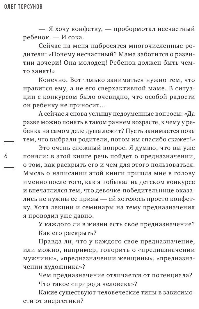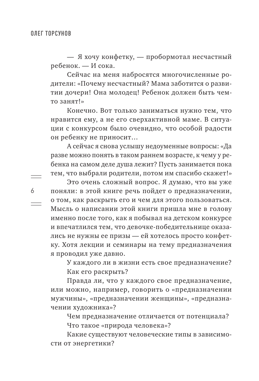 Новая книга Олега Торсунова - признанного специалиста в сфере семейной психологии и практик личностного роста, посвящена самой главной составляющей нашего счастья - теме предназначения. Обретя его, вам не придется выбирать между доходом и самореализацией. На страницах книги вы узнаете о том, как правильно войти в поток, сделав свою жизнь творческой, счастливой и гармоничной. Если вы пока не нашли свое "стопроцентное" призвание, попробуйте что-то сделать для других. Человек, развивающийся духовно, помогающий окружающим, подобен факелу: за ним идут все остальные. Прочитав книгу, вы получите четкий жизненный план, где искать свою путеводную звезду, свой смысл, свой город счастья.