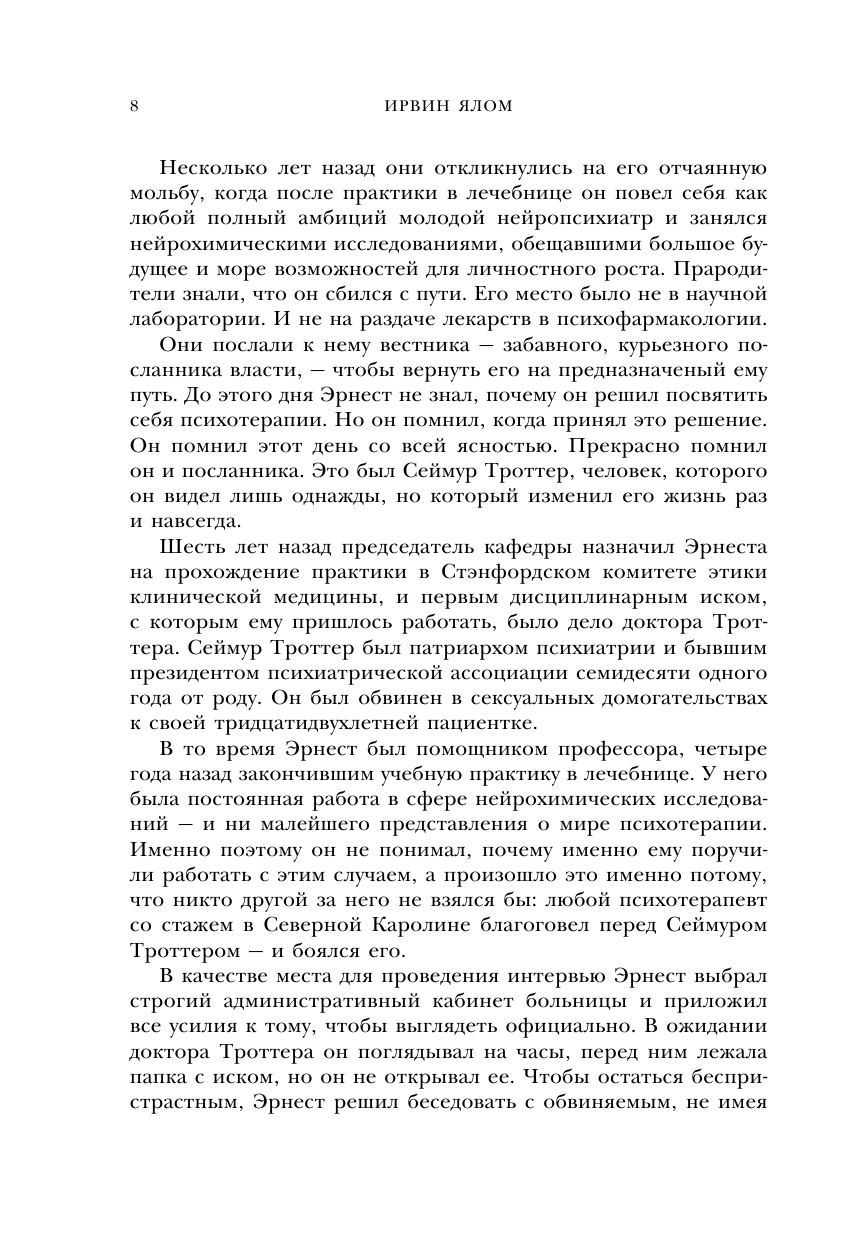 Ялом интересно развивает две параллельные сюжетные линии, каждая из которых показывает развитие главных и второстепенных персонажей. Особенно хочу выделить сюжетную линию Эрнеста и Кэрол: до последнего сохранялась интрига, как будут развиваться их взаимоотношения. Конечный итог не совпал с моими первоначальными ожиданиями и это приятно удивило.