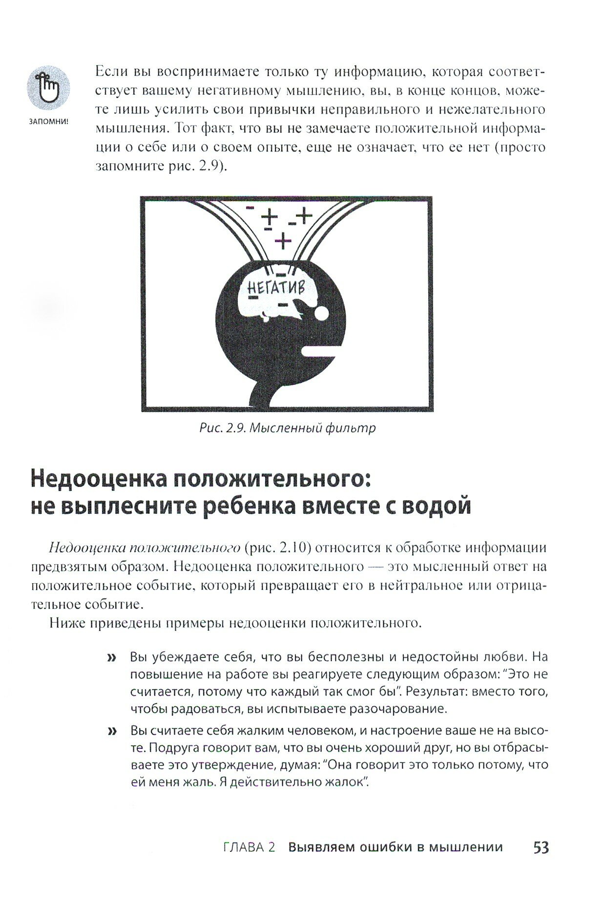 Какой случай бы ты из этой книги ни взял, в сути одно - сунь голову в песок, заставь себя делать по другому, ни слова о том как анализировать глубокие причины своего состояния. Я очень возмущена этой книгой. 2000 рублей это цена консультации у психотерапевта, лучше сходите к нему, чем этот ужас читать.