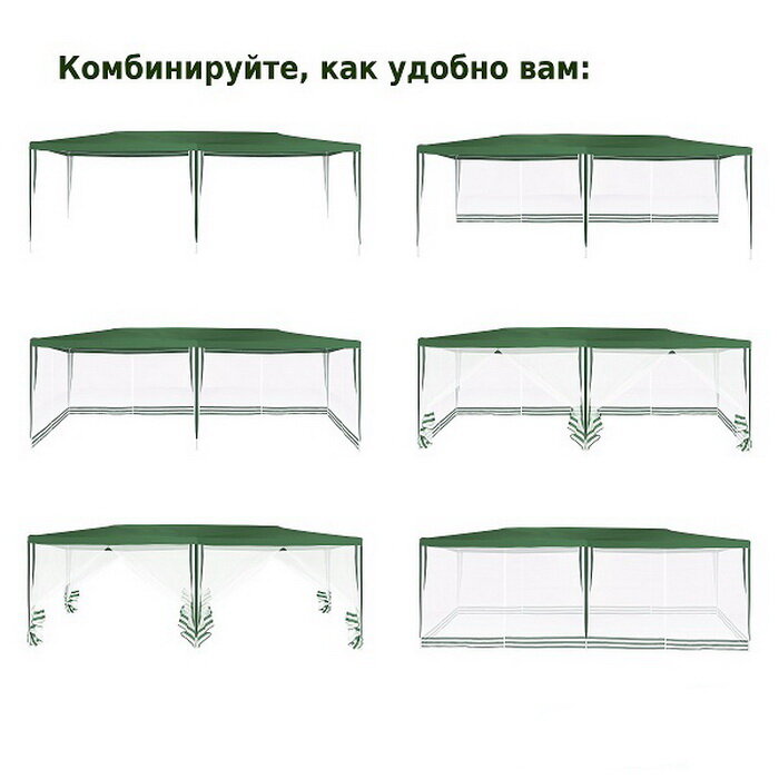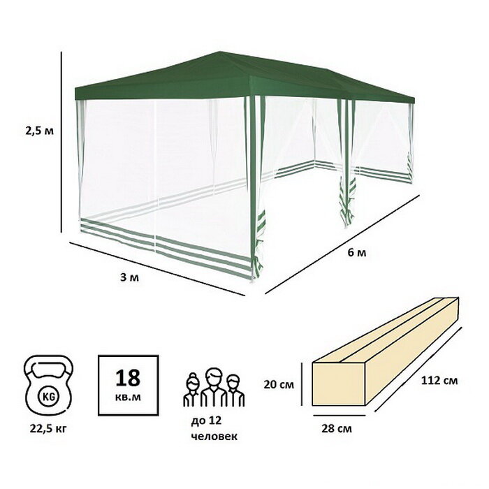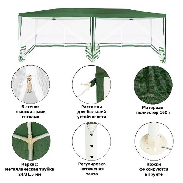 Садовый тент шатер Green Glade - огромный шатер площадью 18 кв.м. в котором с легкостью разместится большая компания. Шатер обезопасит Вас от палящего солнца, а москитная сетка поможет Вам избавиться от надоедливых насекомых. Кемпинговый тент шатер оптимален для проведения мероприятий на открытом воздухе. Если вы решили провести пикник на свежем воздухе, вы сможете без труда установить шатер green glade на любой ровной площадке.