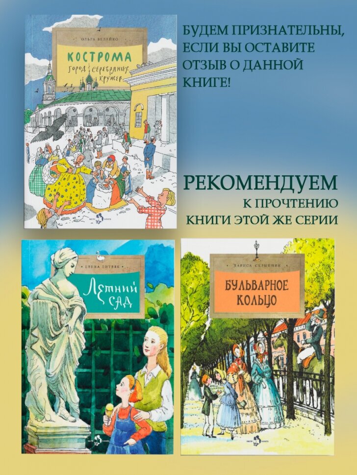 Замечательная серия развивающих книг. И что мы без них делали раньше, как жили?) Купили из этой же серии книги о Новгороде, Петергофе, Царском селе, Эрмитаже, Летнем саде. Данная книга очень информативна, знакомит ребёнка с историей города, с этимологией названия города. Понравилось упоминание о различных занятиях людей этого города, таких как плетение серебряных кружев (скань), производство льняных изделий, изделий из бересты. Интересна и информация о Иване Сусанине. Ребёнок слушал с интересом.