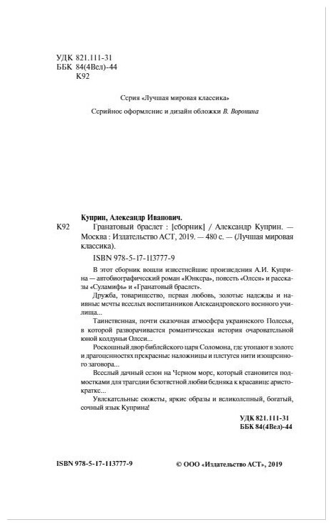 Книгу приобрела ради рассказа "Гранатовый браслет", но с удовольствием прочту и другие, вошедшие в данный сборник. "Гранатовый браслет" входит в школьную программу, в 10-11 классе проходят, в своё время не было возможности его прочесть, но зато много наслушалась от преподавателя- рассказ о любви, о том, как мелкий чиновник полюбил богатую княгиню Веру и на все свои средства приобрел для нее гранатовый браслет, а она даже не удостоила его вниманием. Печальная и трагичная история о безответной любви. Помимо этого рассказа в книгу вошли такие произведения как "Юнкера", "Олеся", "Суламифь", они все о любви: лиричны, трагичны, романтичны. Сама книга толстенькая, 477 страниц, бумага похожа на газетную, шрифт мелкий. Обложка твердая с золотым тиснением.