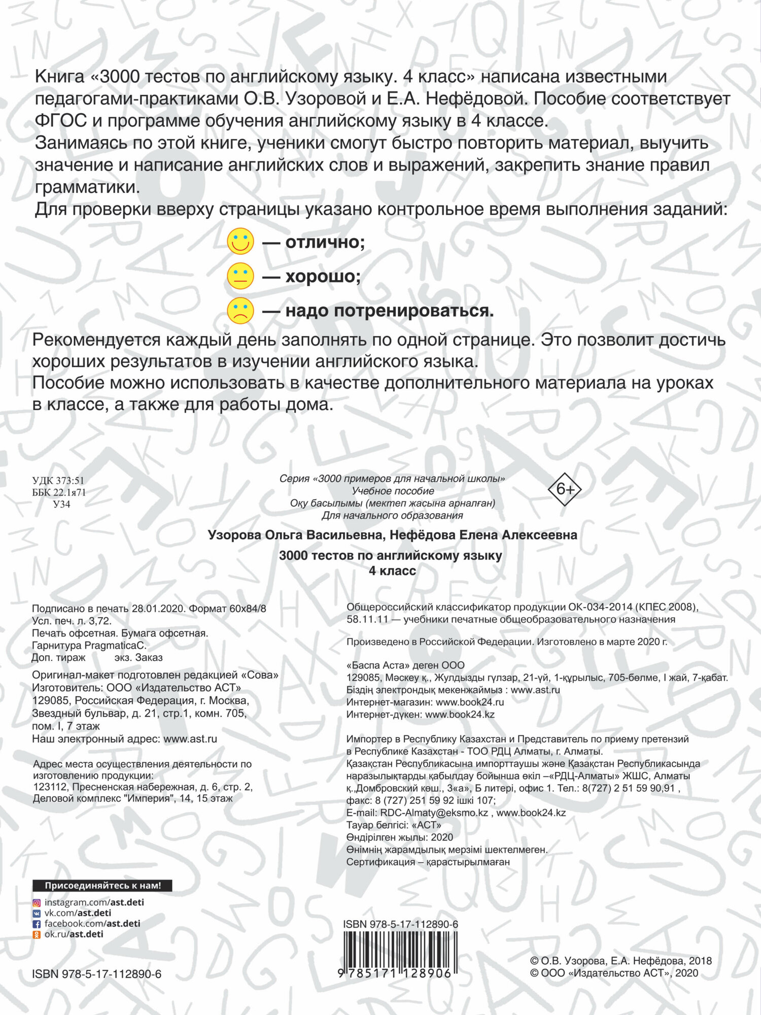 Книга "3000 тестов по английскому языку. 4 класс" написана известными педагогами-практиками О. В. Узоровой и Е. А. Нефёдовой, авторами более 700 учебных пособий для начальной школы. Материал пособия соответствует ФГОС и программе обучения английскому языку в 4 классе и даёт возможность ученикам быстро проверить свои знания по английскому языку. Учителя и родители могут отметить время, которое ребёнок затратил на выполнение тестов. На каждой странице дано контрольное время.