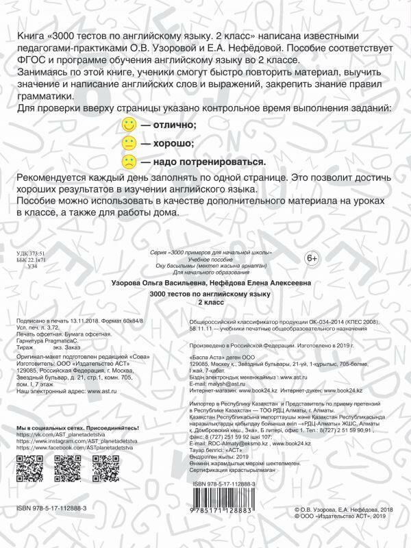 Книга "3000 тестов по английскому языку. 2 класс" написана известными педагогами-практиками О. В. Узоровой и Е. А. Нефёдовой, авторами более 700 учебных пособий для начальной школы. Материал пособия соответствует ФГОС и программе обучения английскому языку во 2 классе и даёт возможность ученикам быстро проверить свои знания по английскому языку. Учителя и родители могут отметить время, которое ребёнок затратил на выполнение тестов. На каждой странице дано контрольное время.