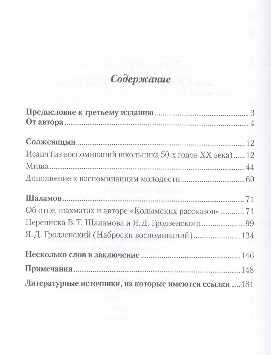 В книге Сергея Гродзенского «Воспоминания об Александре Солженицыне и Варламе Шаламове» автор делится личными впечатлениями о выдающихся писателях, с которыми был знаком задолго до того, как их имена стали известны всему миру. А. Солженицын — его школьный учитель, В. Шаламов — близкий друг его отца. В книге приводятся ранее неизвестные факты из биографий известных писателей, например об их отношении к шахматам..Книга адресована широкому кругу читателей, в первую очередь тем, кто интересуется отечественной историей...