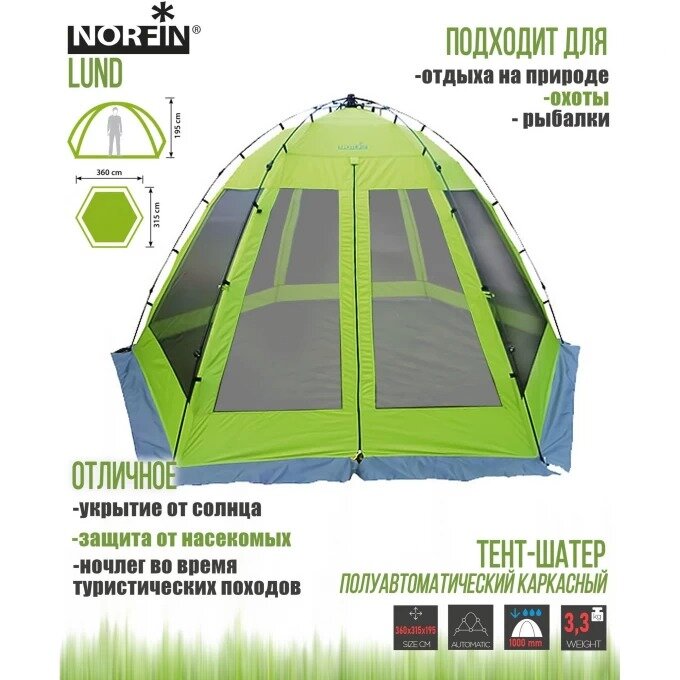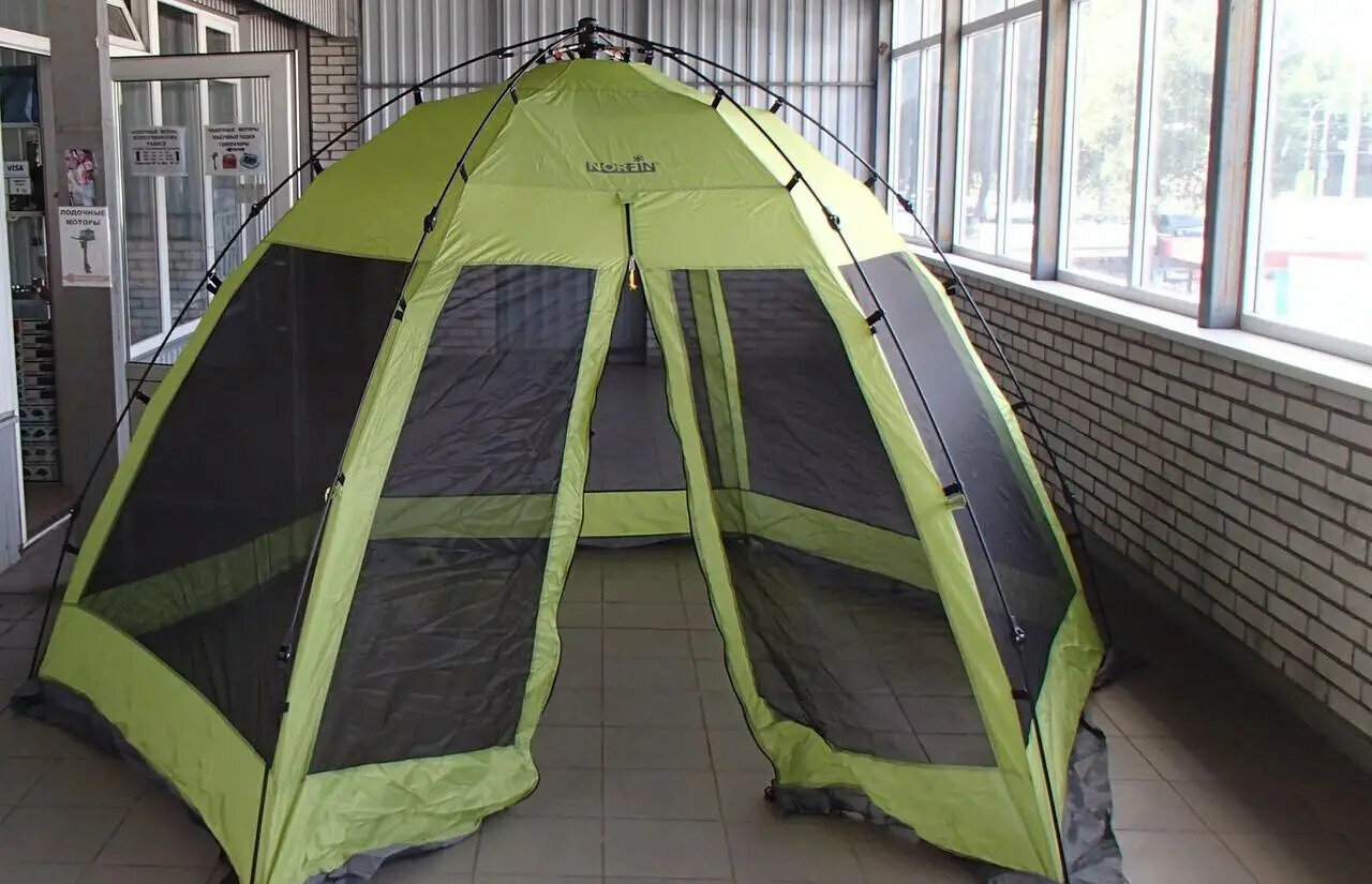 Шатер Norfin зеленый - летний каркасный шатер, идеально подходящий для рыбалки и кемпинга. Он обеспечит надежную защиту от ветра и влаги благодаря проклеенным герметизированным швам.