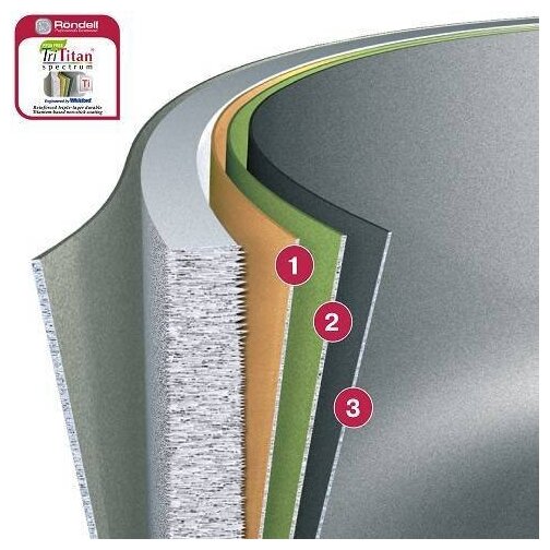Сотейник Rondell "Latte" изготовлен из штампованного алюминия с внутренним антипригарным покрытием TriTitan Spectrum. Покрытие содержит три слоя: - внешнее керамическое покрытие молочного цвета, - твердый абразивный слой металла, обеспечивающий максимальное сцепление с поверхностью, - антипригарное покрытие TriTitan Spectrum. Покрытие TriTitan Spectrum кофейного оттенка на основе титана абсолютно безвредно, не содержит PFOA.
