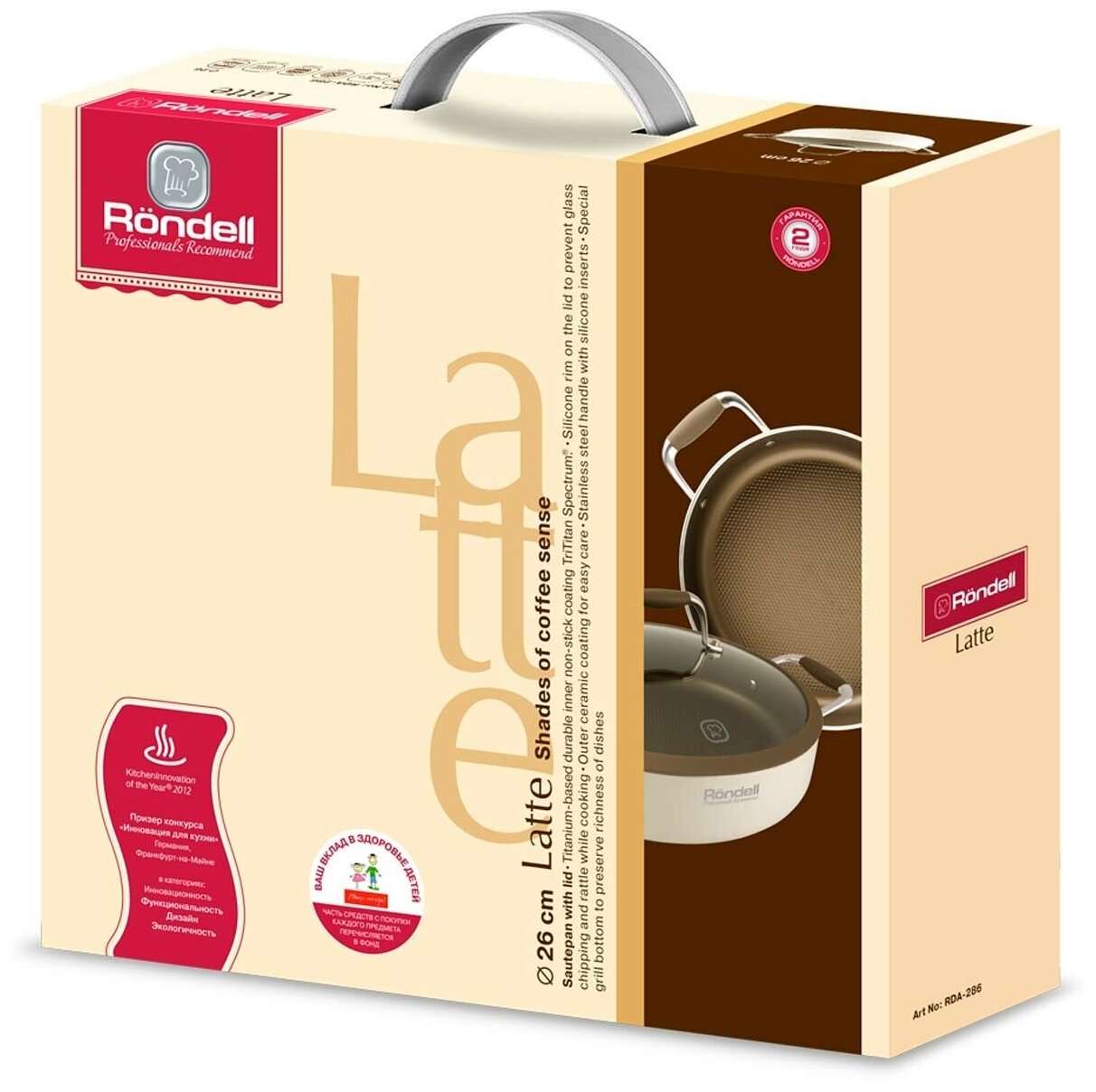 Сотейник диаметром 26 см Внешнее керамическое покрытие цвета Топленое молоко и отличным покрытием внутри на основе Титана Материал Rondell Latte – штампованный алюминий, легкий, и в то же время прочный и долговечный. Толщина стенок составляет 3,5 мм. Толщина дна - 3,5 мм. Внутреннее покрытие - антипригарное покрытие TriTitan Spectrum - трехслойное, износостойкое антипригарное покрытие на основе титана. Снаружи - керамическое покрытие оттенка топленого молока.