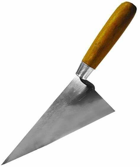 Стальное полотно в форме треугольника, деревянная усиленная рукоятка. Назначение: Для кладки кирпича и нанесения штукатурных смесей.